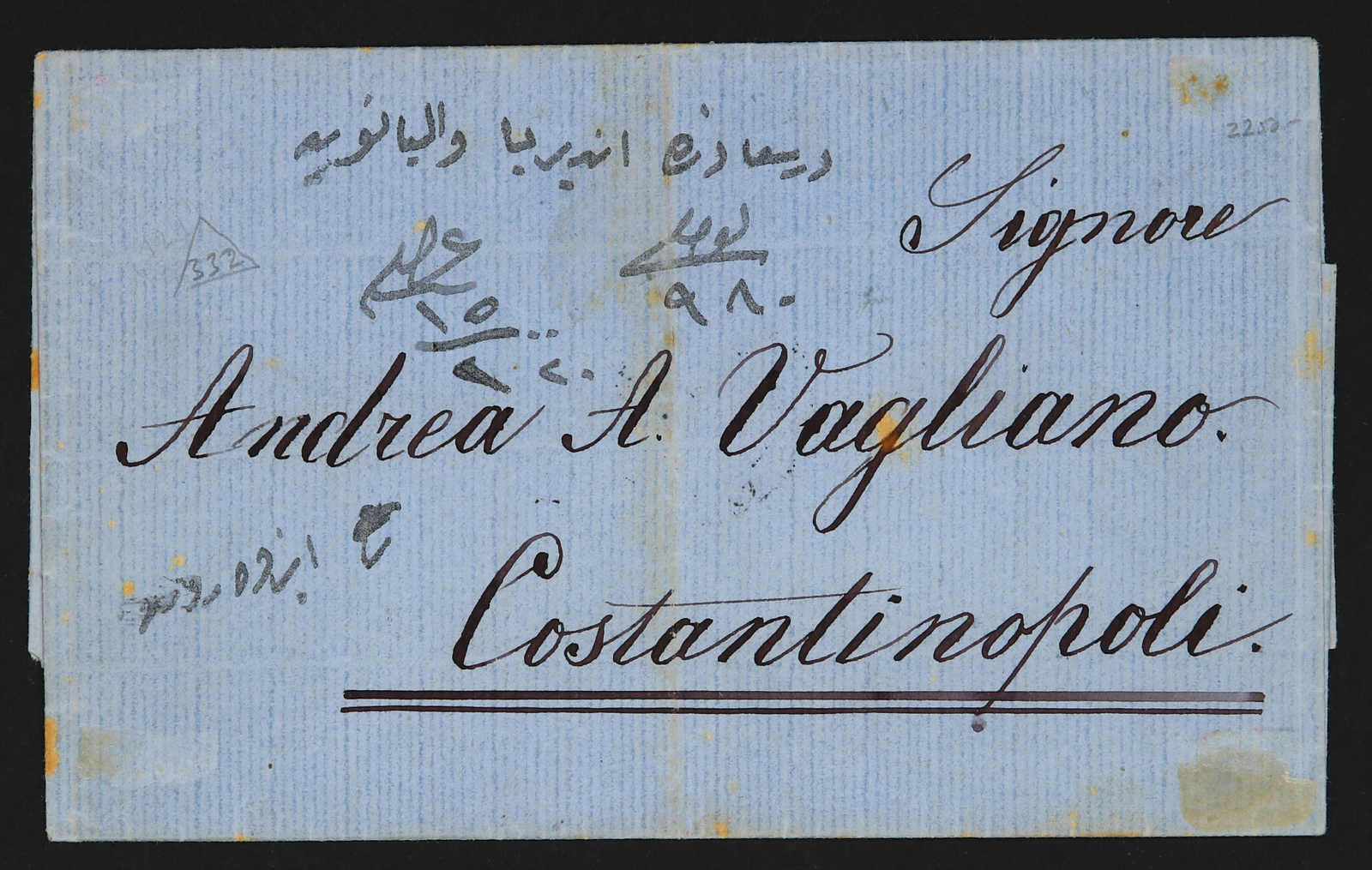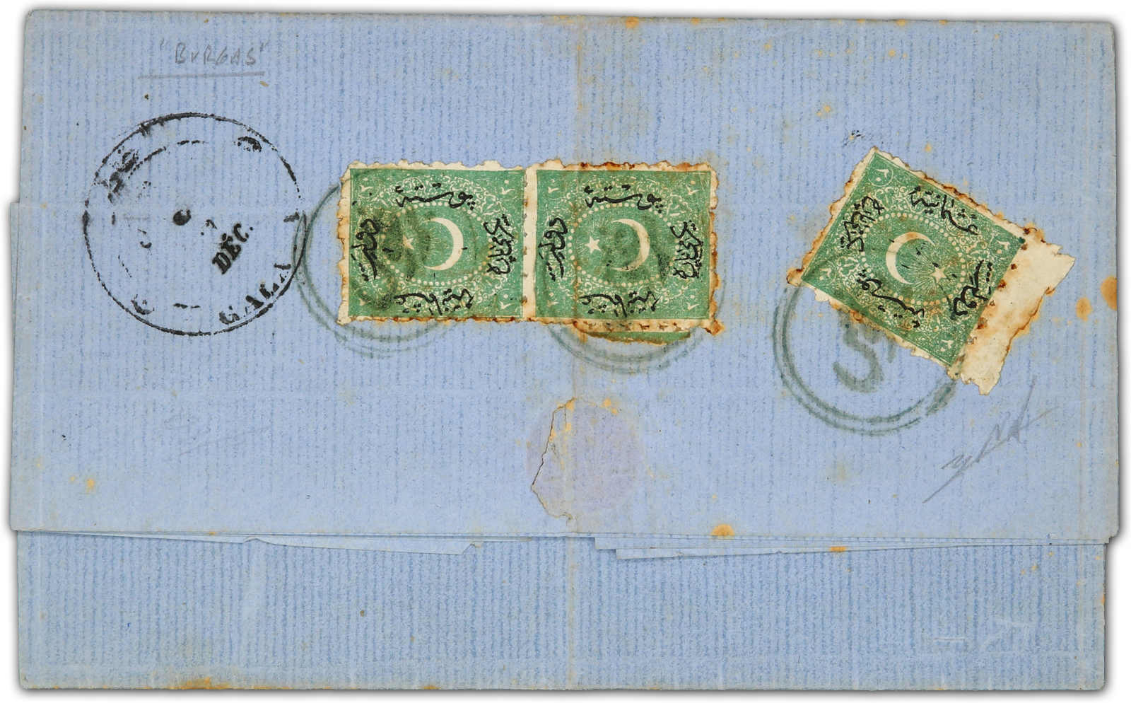 Burgas - Burgaz: 1873, entire from Burgas to Constantinople bearing on reverse Duloz 1868/71 20 pa. green single and pair, crossed by file fold, tied by Arabic double-circle "Bergos" handstamps in green (Coles & Walker fig. 8), Galata