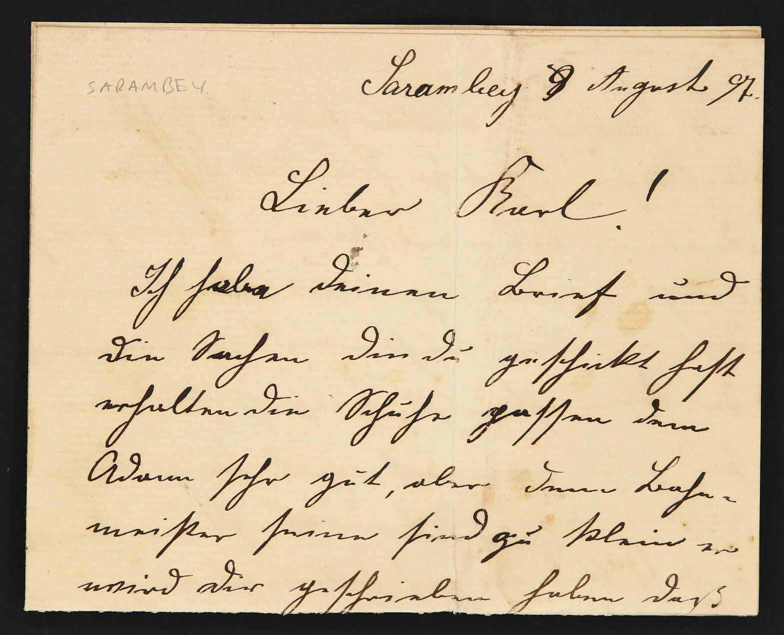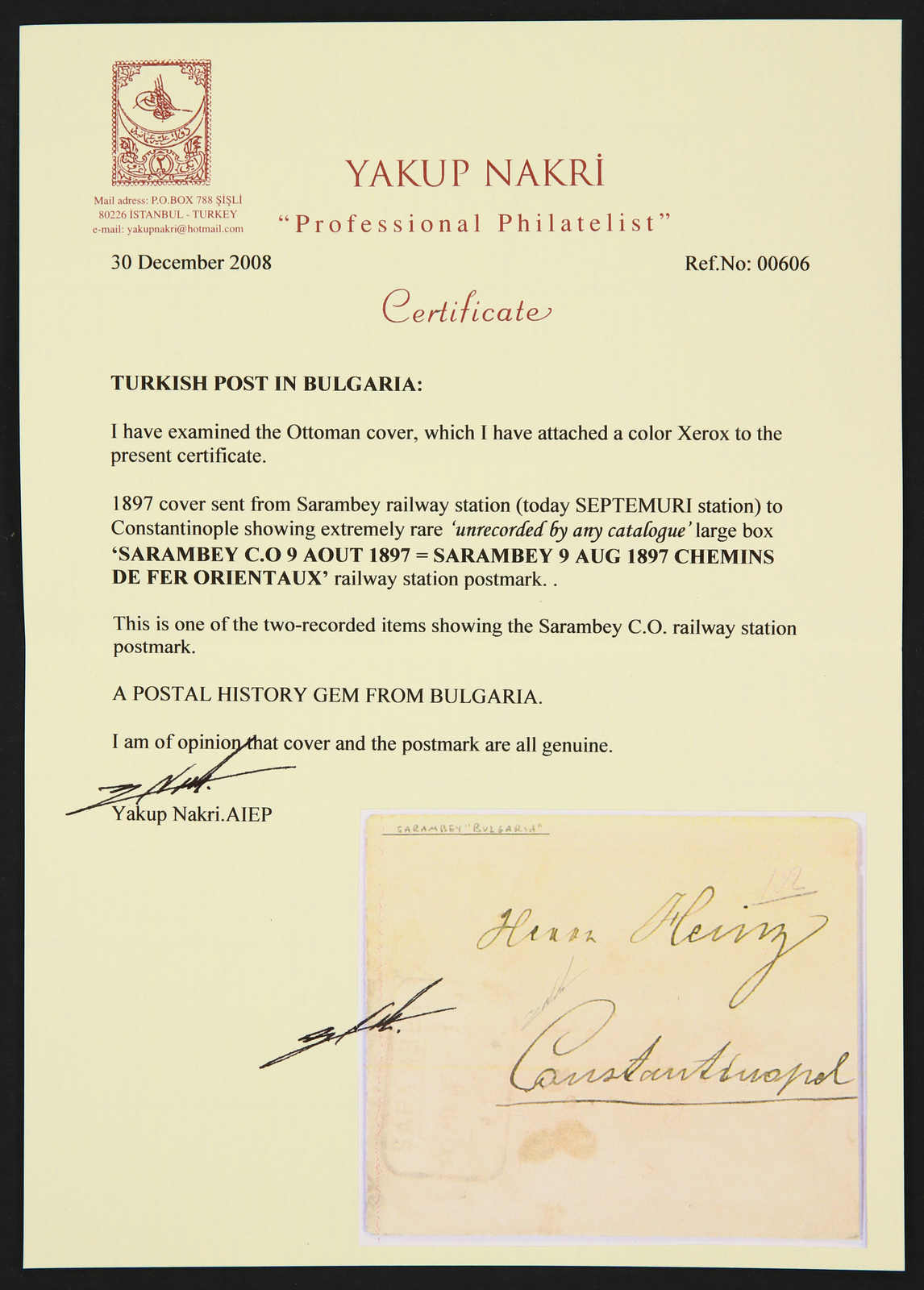 Septemuri - Sarambey: 1897, envelope sent from Septemuri Ottoman Railways station to Constantinople showing extremely rare faint large rectangle "Sarambey/C.O/ 9 Aout 1897" (="Sarambey 9 Aug 1897 Chemins de fer Orientaux") railway station