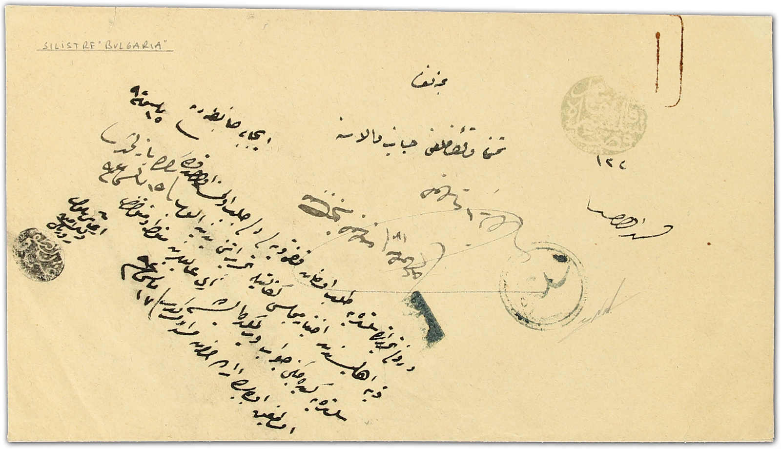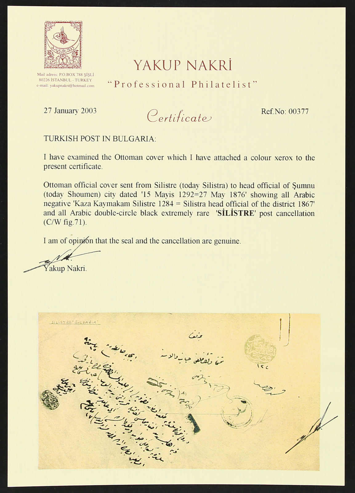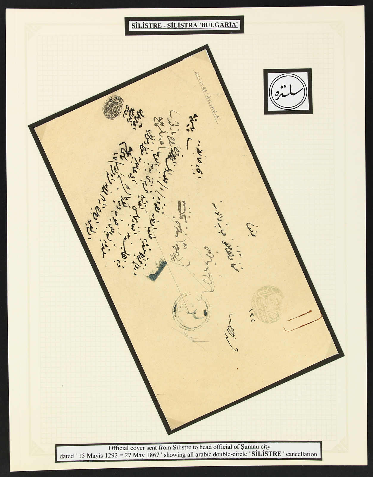 Silistra - Silistre: 1876, official cover from Silistra to Shumen dated 15 Mayis 1292 = 27 May 1876 showing all Arabic negative "Kaza Kaymakam Silistre 1284" and extremely rare Arabic double-circle "Silistre" black handstamp (Coles &