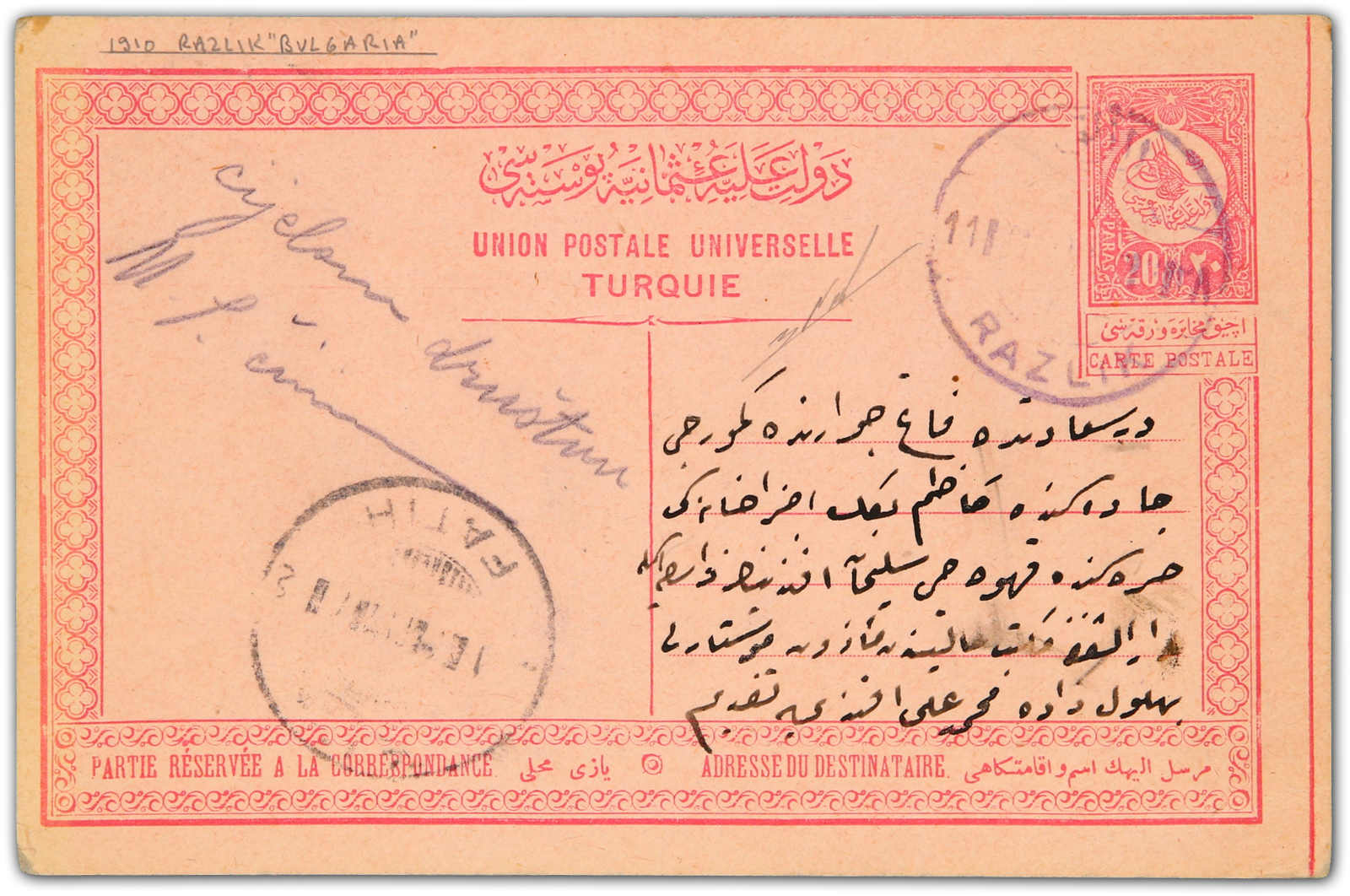 Razlog - Razlık: 1910, postal stationery 20 para used from Razlog to Constantinople showing bilingual "Razlık" cds (Coles & Walker fig. 57), bilingual "FATIH" arrival cds alongside, signed Nakri (Image) (imagea)