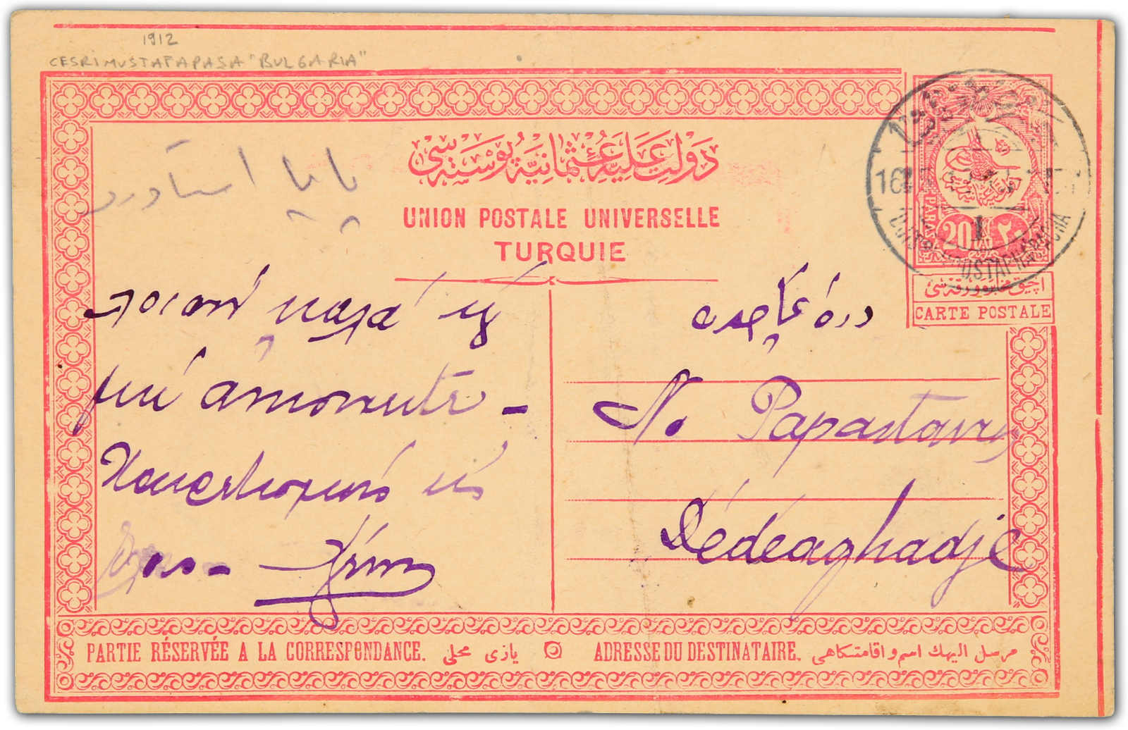 Svilengrad - Cisri Mustafapaşa: 1910, 20 pa. rose-red postal stationery card used in 1912 with file fold, sent from Slivengrad to Dedeagatch showing bilingual date stamp of "DJISRI-MOUSTAFA-PACHA 1" in black (Isfila AP08) (Image) (imagea)