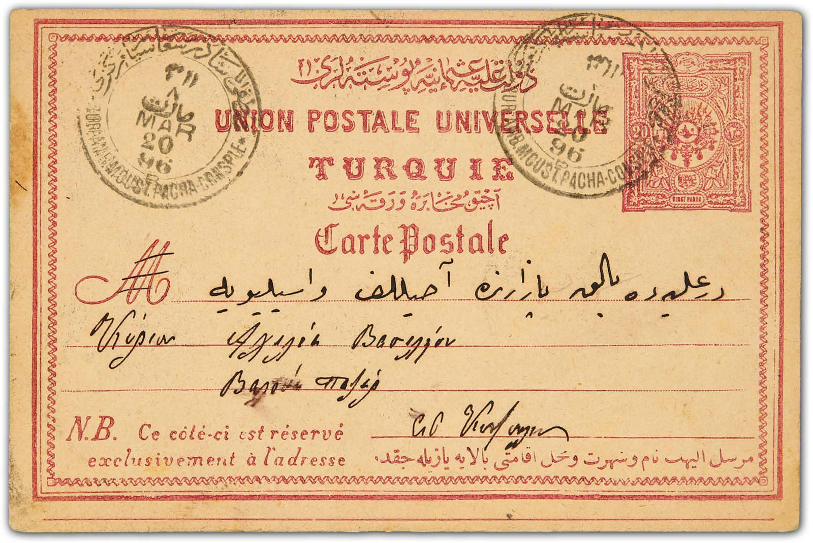 Svilengrad - Cisri Mustafapaşa: 1892, 20 pa. claret postal stationery card used to Constantinople showing bilingual "BUR.AMB.MOUST. PACHA-CONSPLE" black TPO datestamps (March 20, 1896), unrecorded by any catalogue (Image) (imagea)