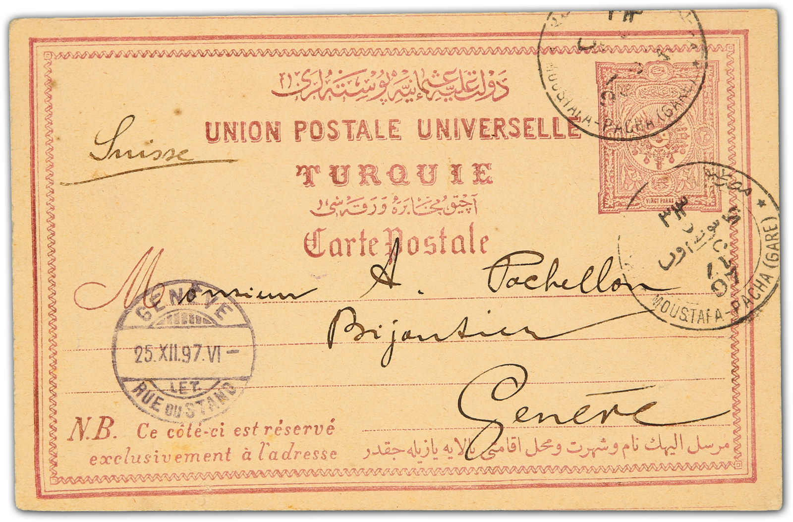 Svilengrad - Cisri Mustafapaşa: 1892, 20 pa. claret postal stationery card used from Andrinople to Geneva, showing very fine bilingual 'Moustafa-Pacha (Gare)' circular dated cds's in black. Arrival cds (Christmas Day) at left. Unrecorded