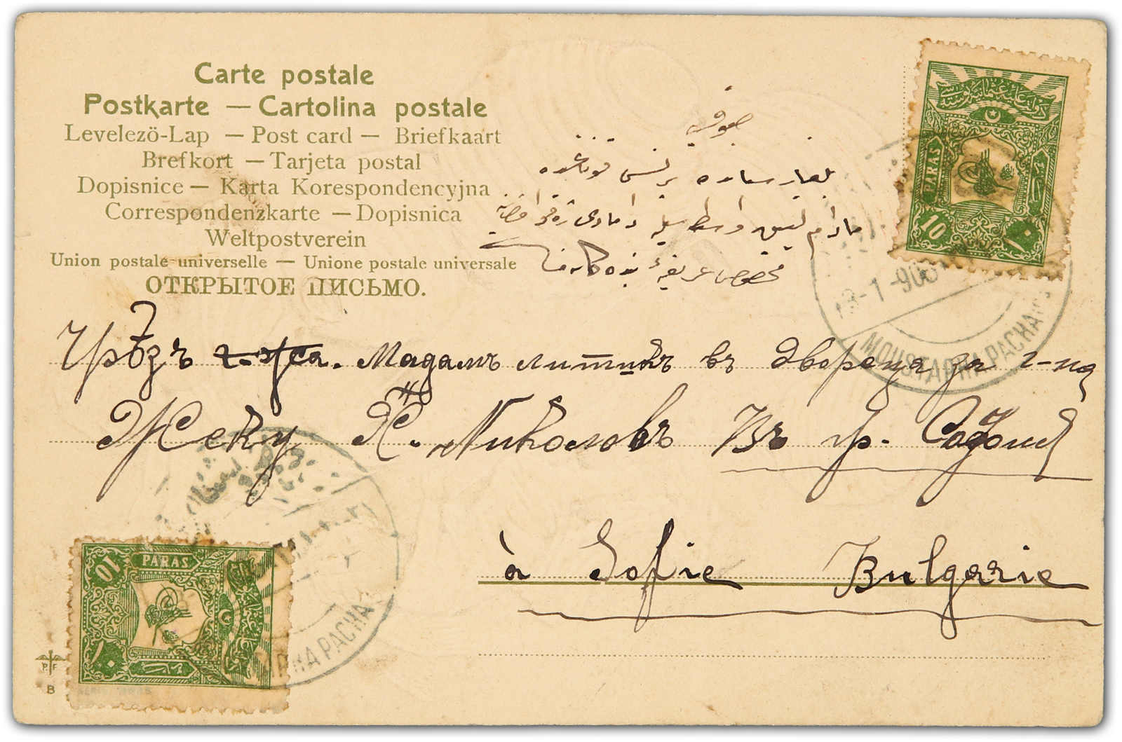 Svilengrad - Cisri Mustafapaşa: 1906, postcard from Svilengrad to Sofia bearing 1905 issue 10 pa. green (2) tied by bilingual "MOUSTAPHA-PACHA" date stamps, unrecorded by any catalogue. (Image) (imagea)
