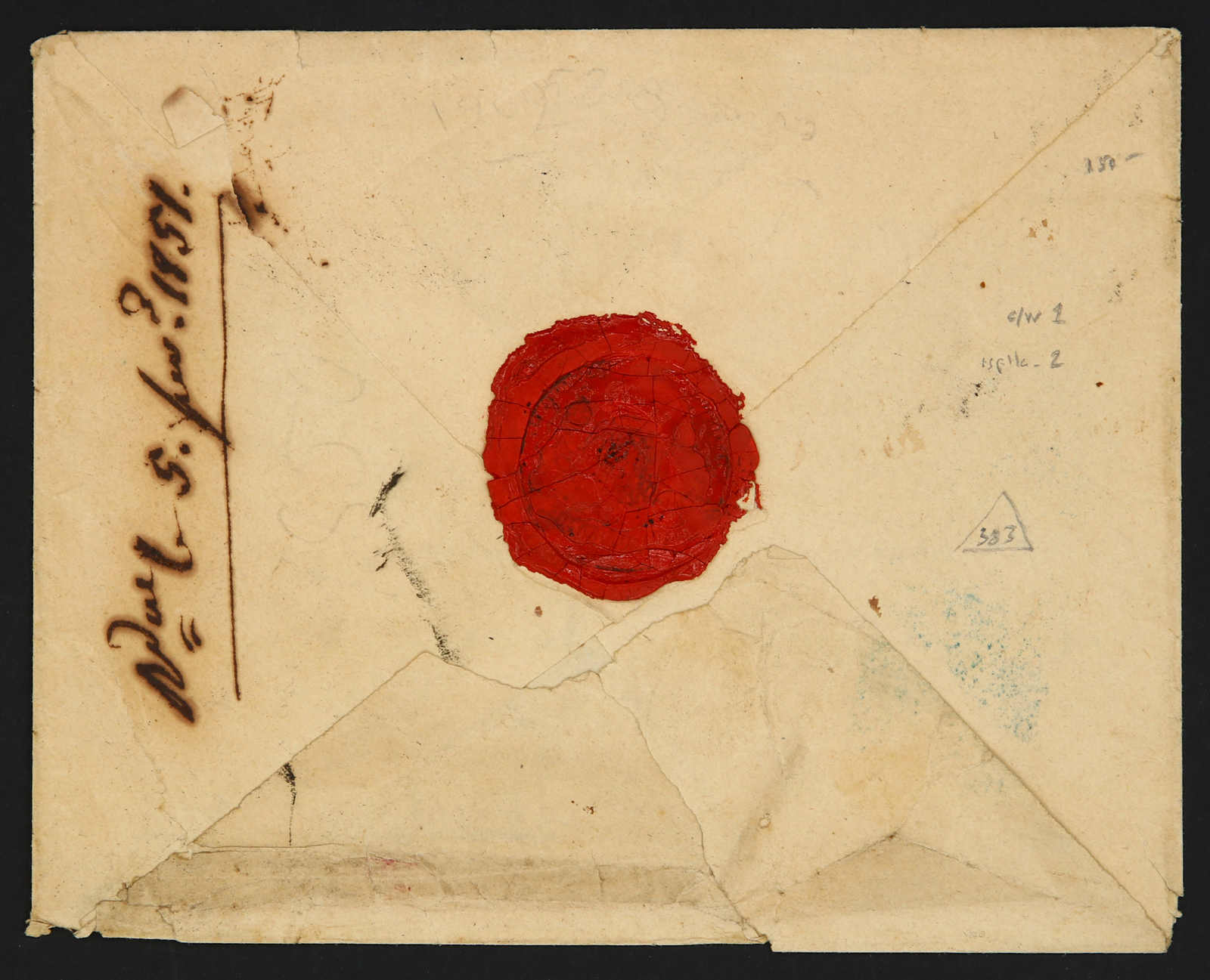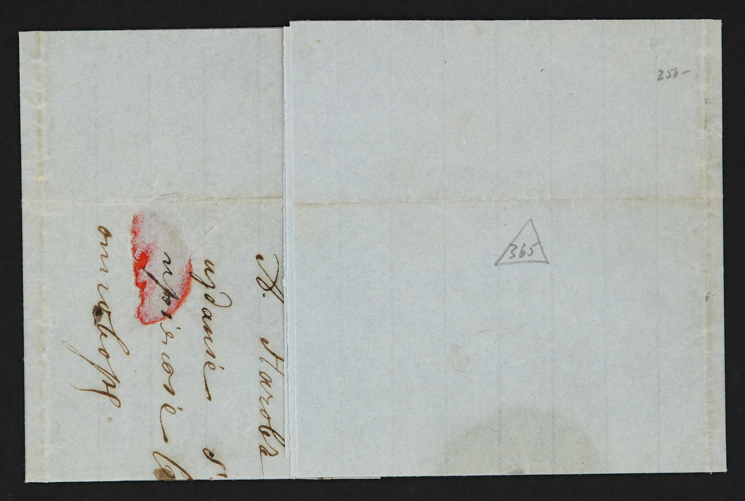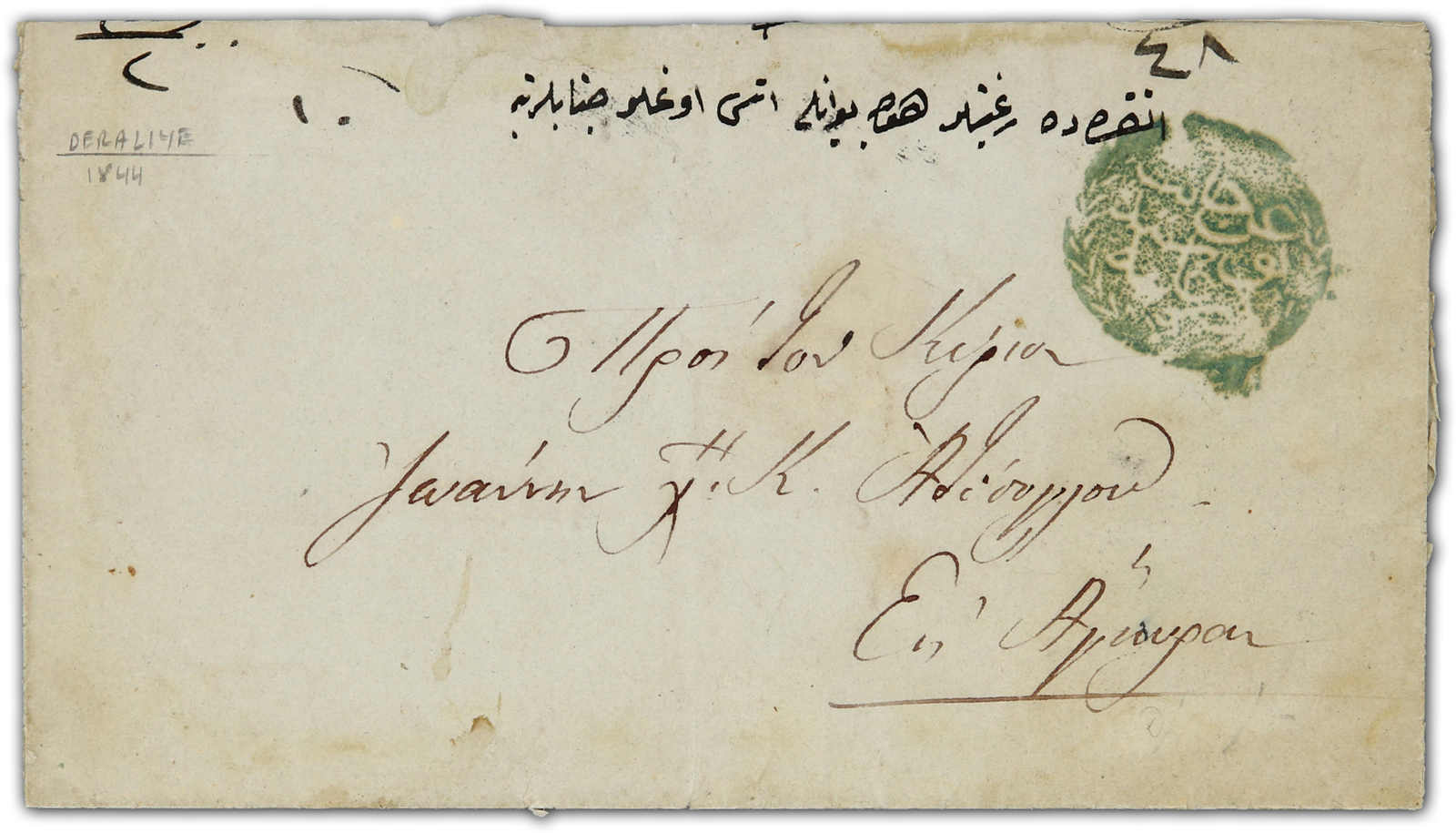 5382 Brief imageDersaadet - Deraliye-Istanbul-Constantinople: 1844, entire letter sent from Constantinople to Ankara showing all Arabic negative greenish "An Canib Posta-i Deraliye 58" (="On behalf of Constantinople Post office 1842") seal, weight 3 Dirhem / postal charge 2 piastres and 10 para in manuscript at top left side of the cover, Coles & Walker fig. 3 (Image)