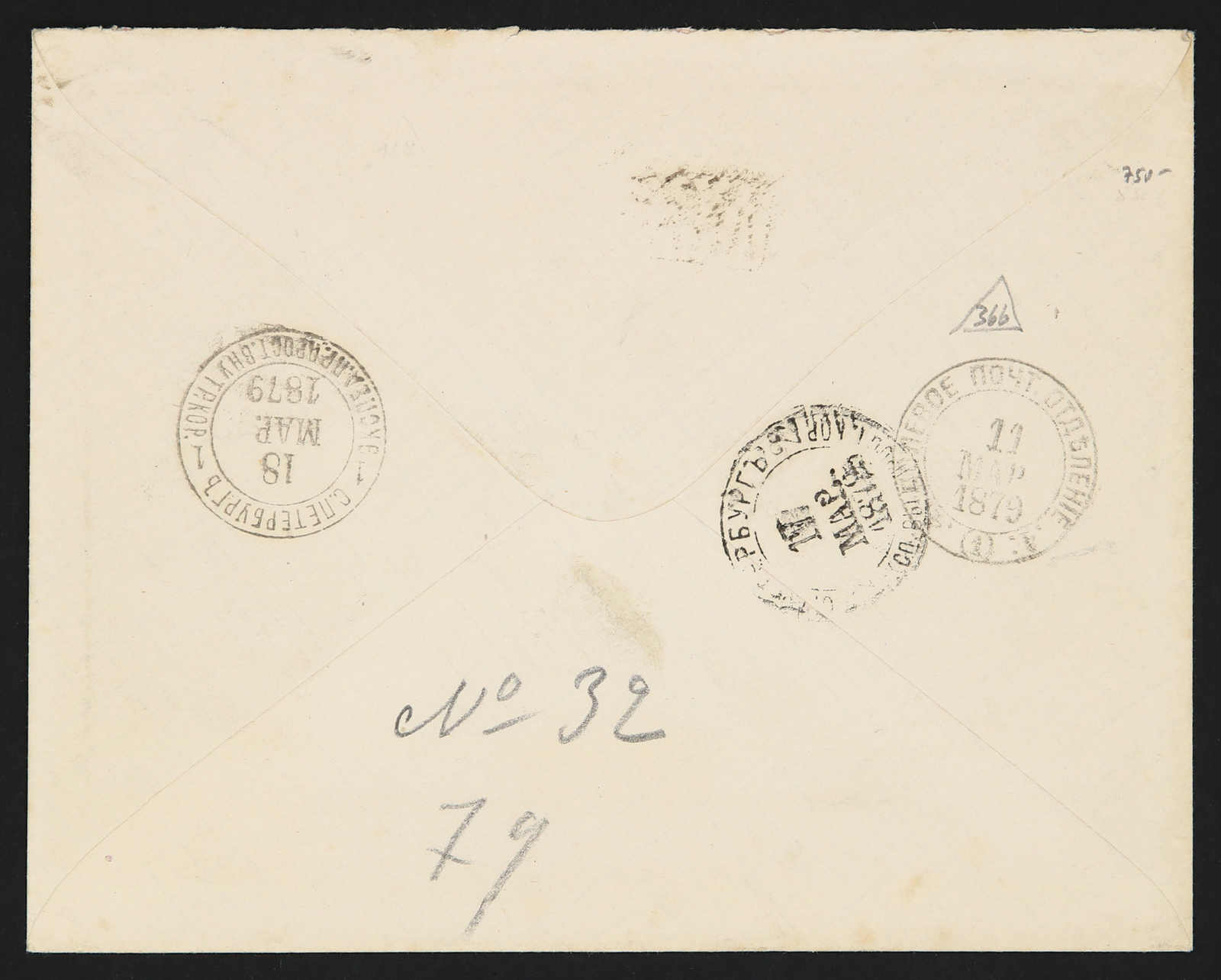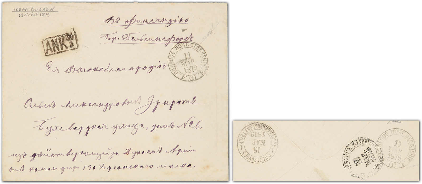 5366 Brief imageVarna: 1879, cover sent from a soldier in Varna to Finland dated "11 March 1879", showing fine struck of all Cyrillic "ПОЛЕВОЕ ПОЧТ.ОТДБЛЕНIЕ 4.(1) 4. / 11.MAP 1879" (="FIELD POST SECTION 4.(1) 4./ 11.MARCH 1879") handstamp in black (Tchilinghirian fig. 61/4), transit and arrival bs, signed Nakri (Image) (imagea)