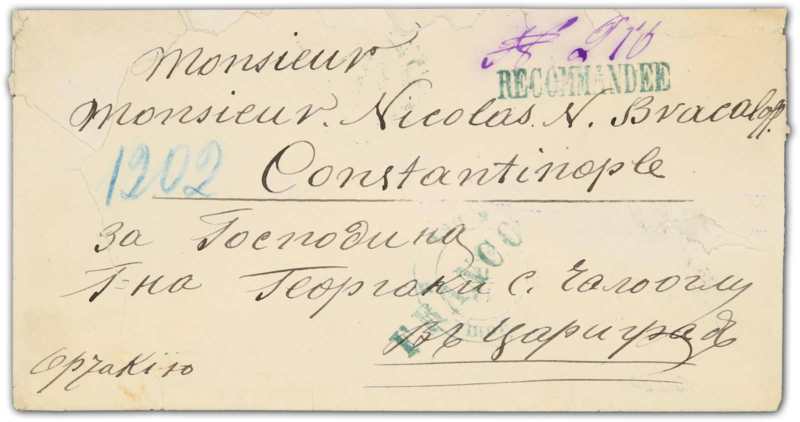 5367 Brief imagePlovdiv-Filibe: 1880, registered cover from Plovdiv to Constantinople showing "RECOMMANDEE" and "FRANCO" in green, together with faint Cyrillic "FILIPPOPOL / PLOVDIV" cds (Tchilinghirian fig.77), reverse with arrival cds in blue (Image) (imagea)