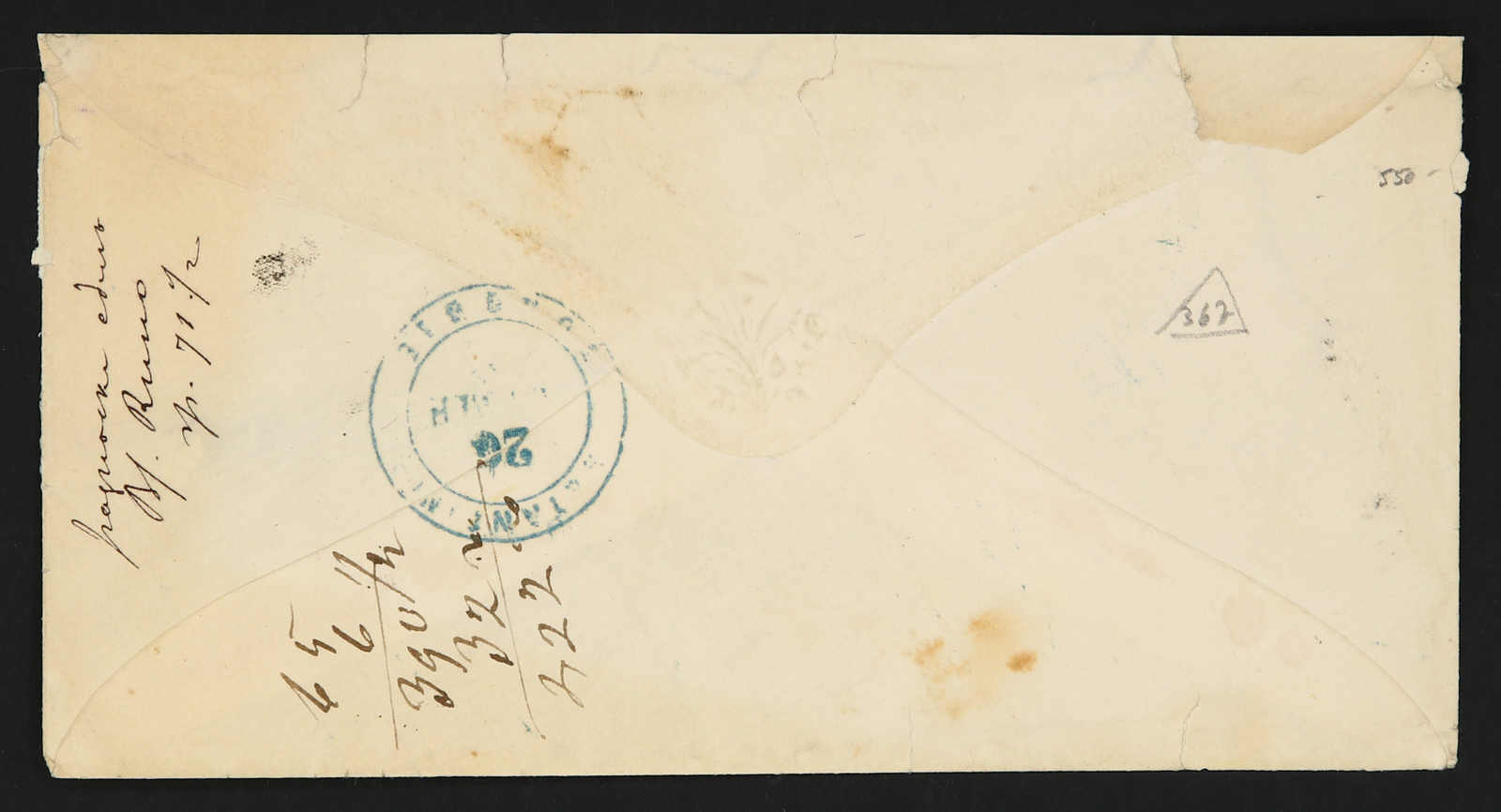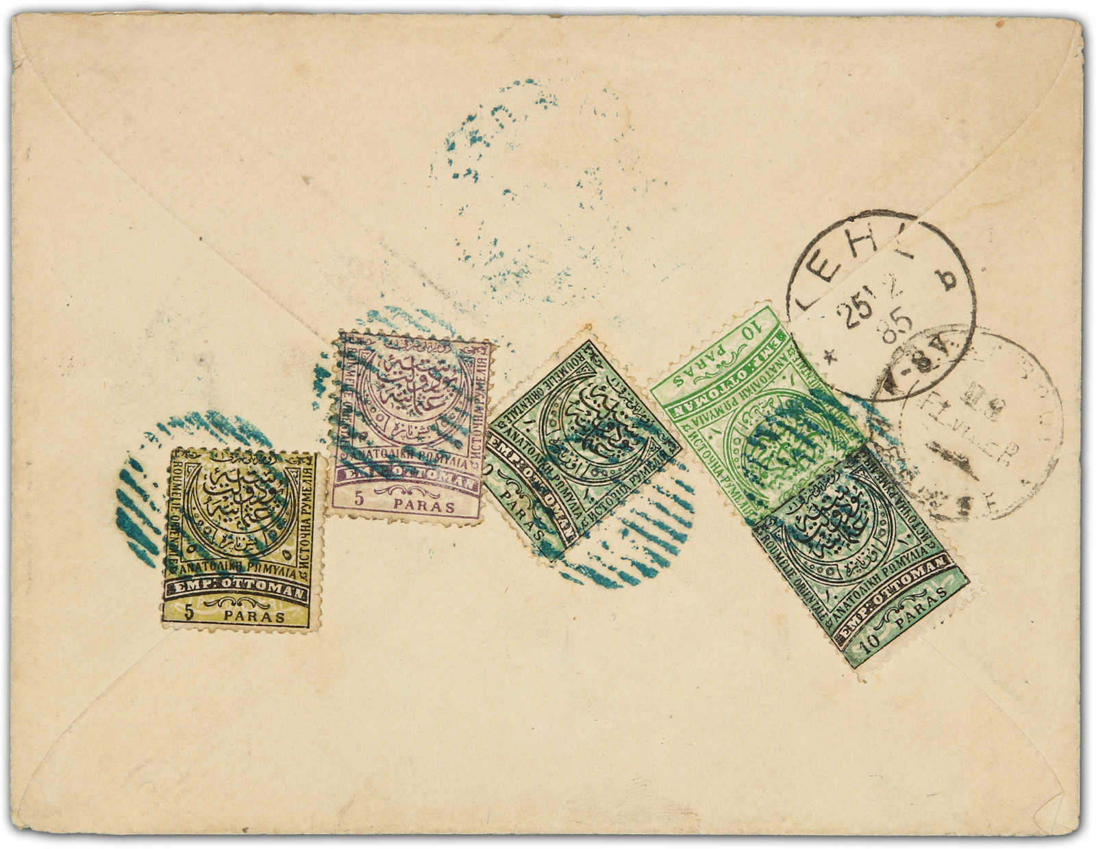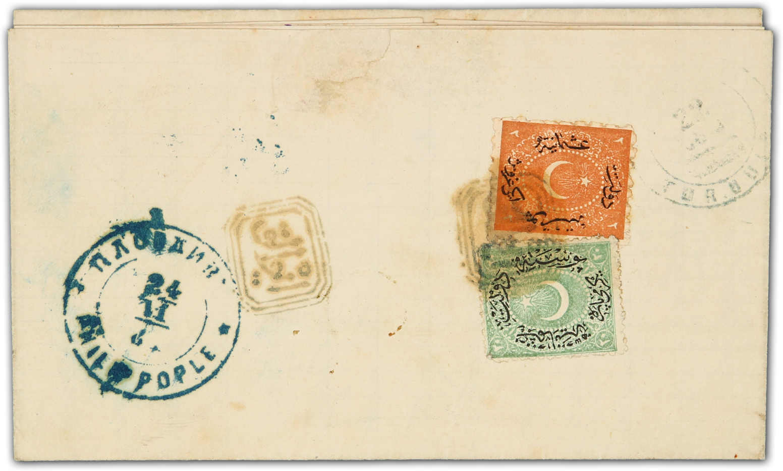 5368 Brief Michel:28,16B imagePlovdiv-Filibe: 1881, entire sent from Ayvalık to Plovdiv bearing on reverse Duloz 1871 2 piastres and 1877 20 para tied by triple-octagonal Arabic "Ayvalık" handstamp (Coles & Walker fig. 60), alongside bilingual "FILIPPOPOL / PLOVDIV" cds (Image) (imagea)