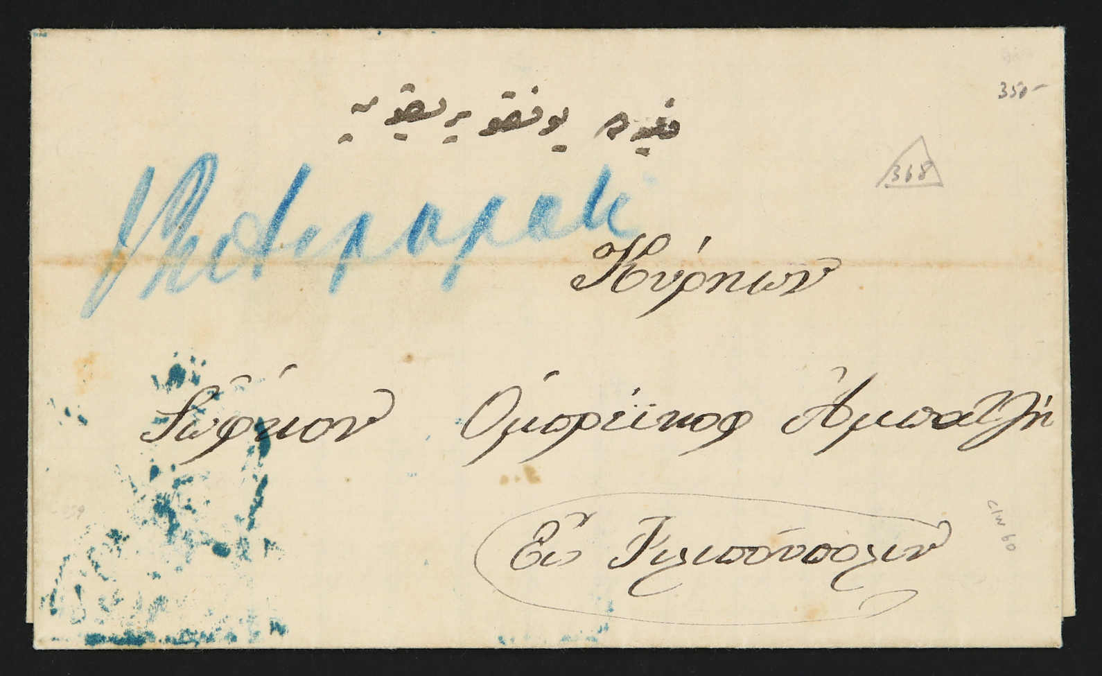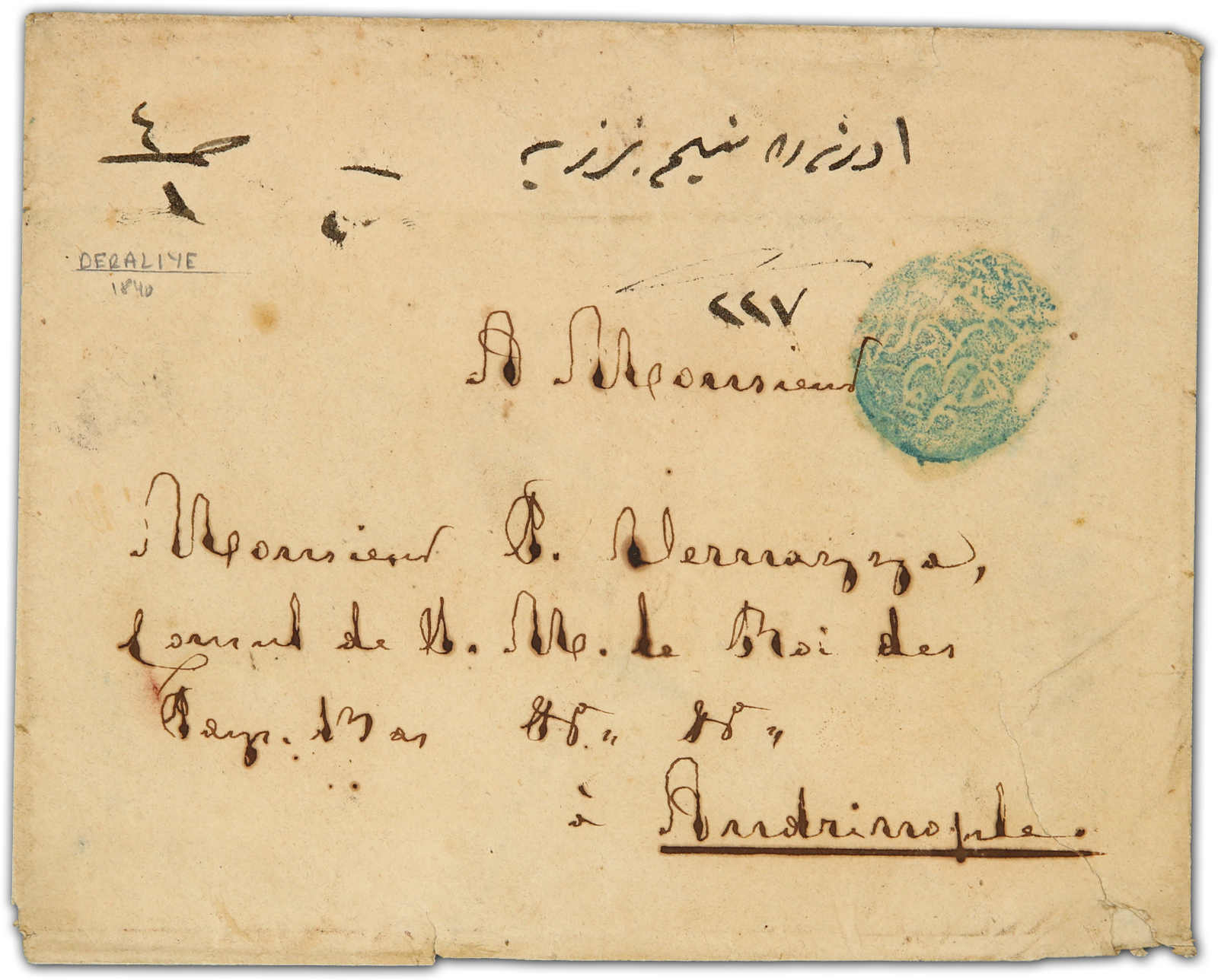 5383 Brief imageDersaadet - Deraliye-Istanbul-Constantinople: 1840, cover sent from Constantinople to Edirne showing all Arabic negative greenish blue "An Canib Posta-i Deraliye 256" (="On behalf of Constantinople Post office 1840") seal, weight 4 Dirhem / postal charge 1 piastre and 20 para in manuscript at top left side of the cover, Coles & Walker fig. 1 / isfila fig. 2 (Image) (imagea)