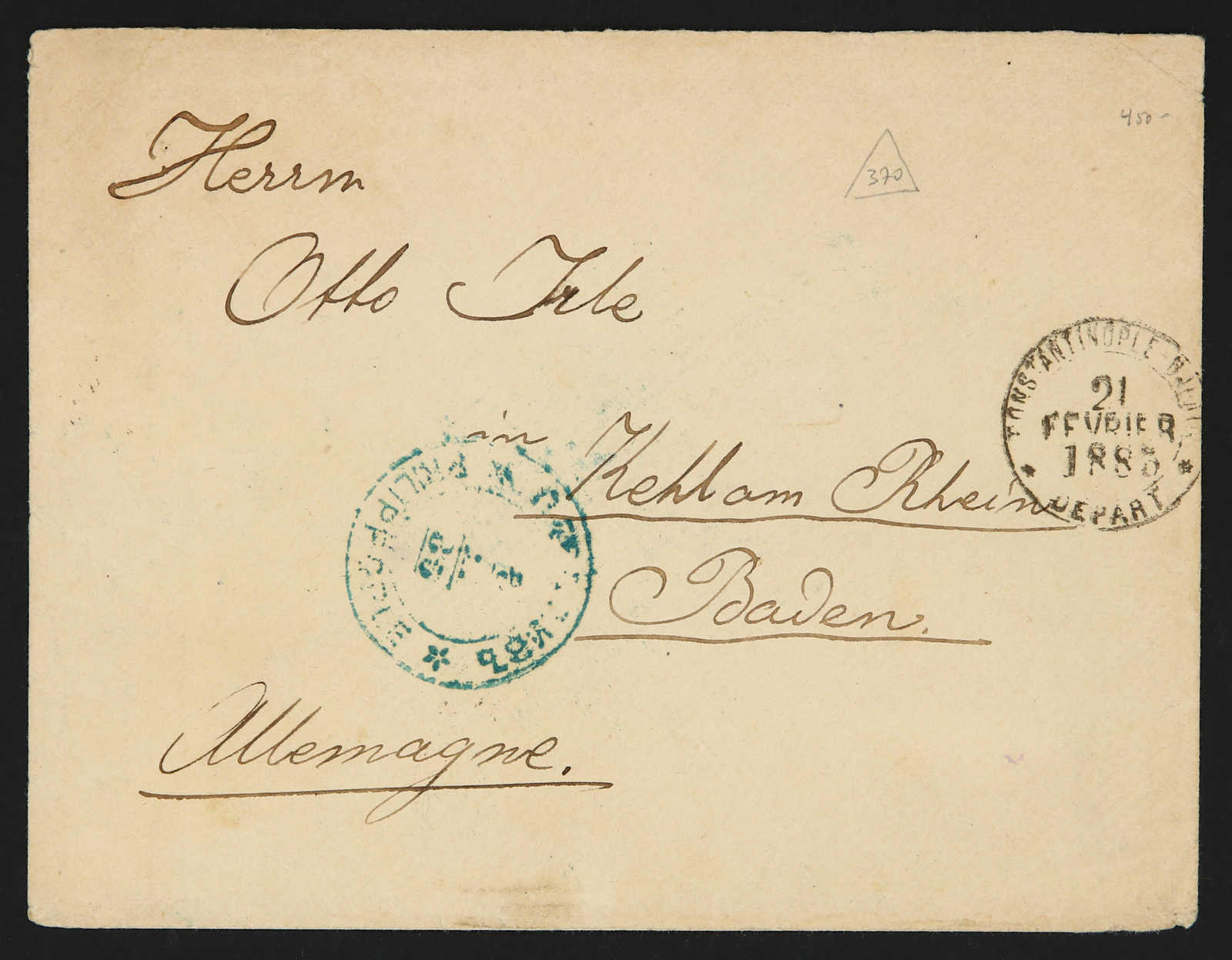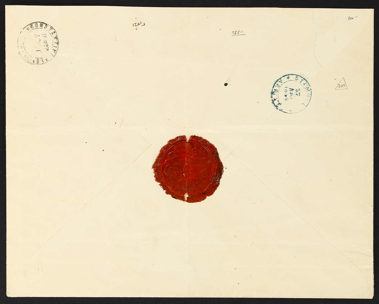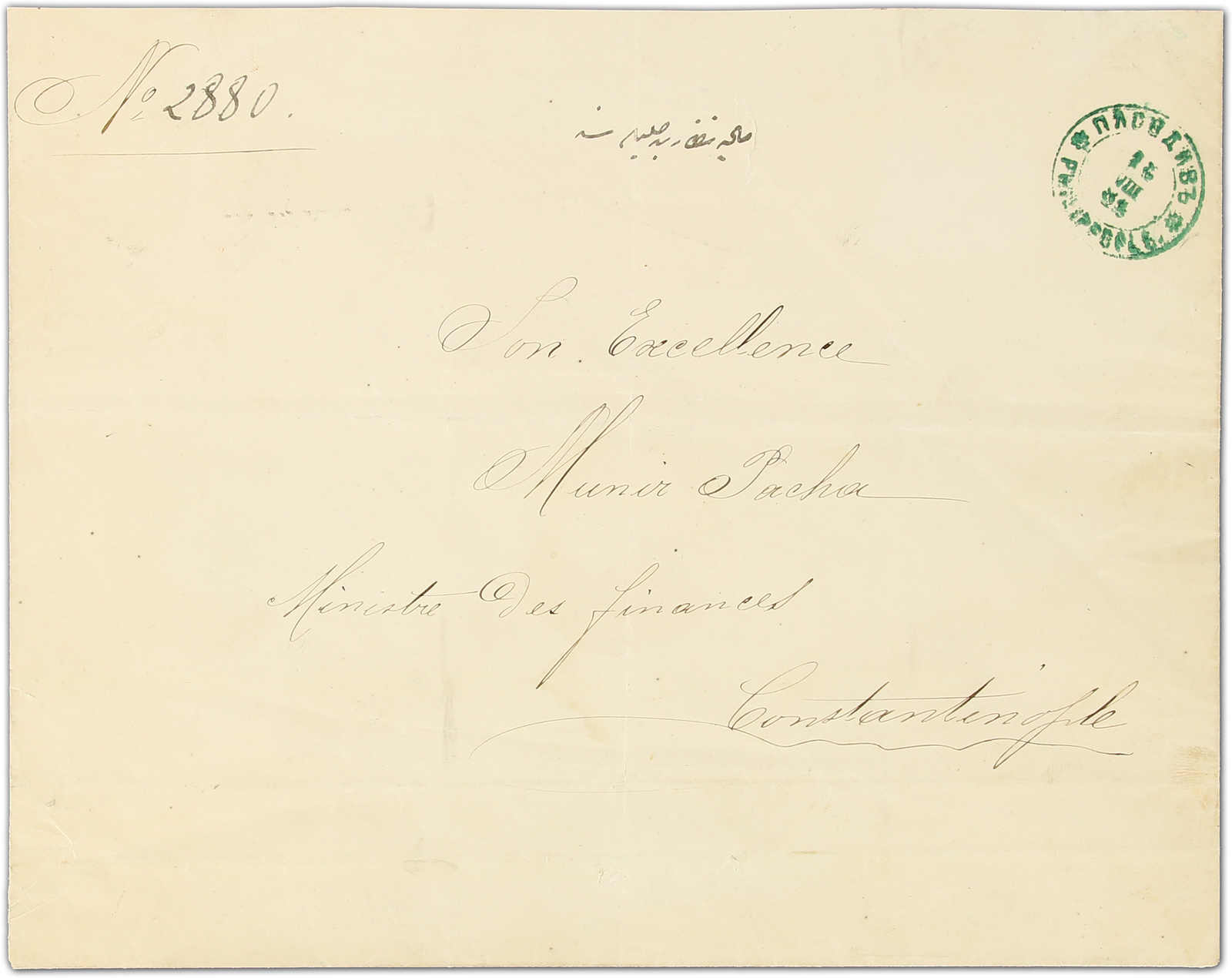 5369 Brief imagePlovdiv-Filibe: 1884, official cover from Plovdiv to Constantinople showing bilingual "PHILIPPOPLE" date stamp in blue (15/VIII), reverse with Constantinople arrival cds in black (Image) (imagea)