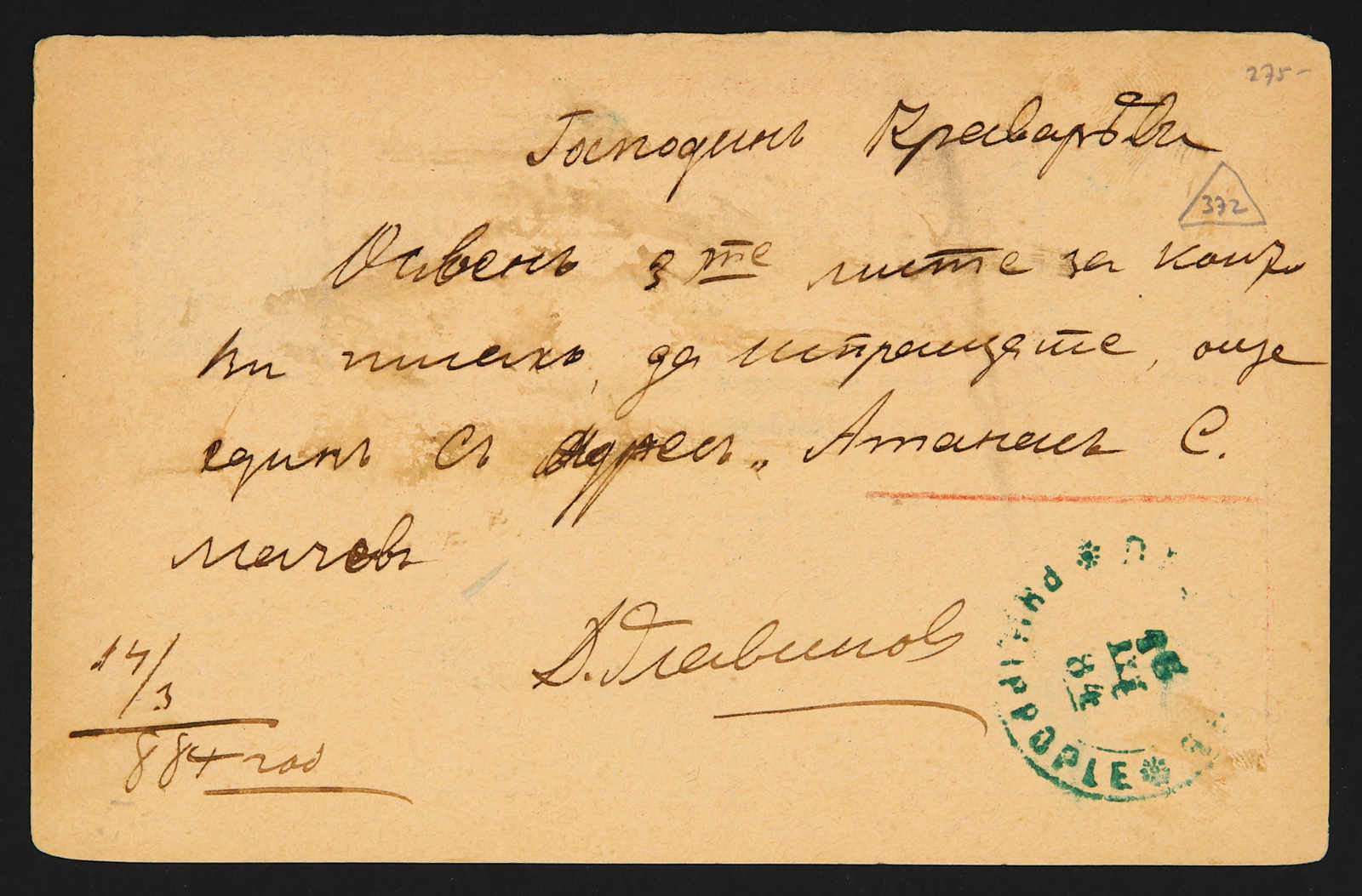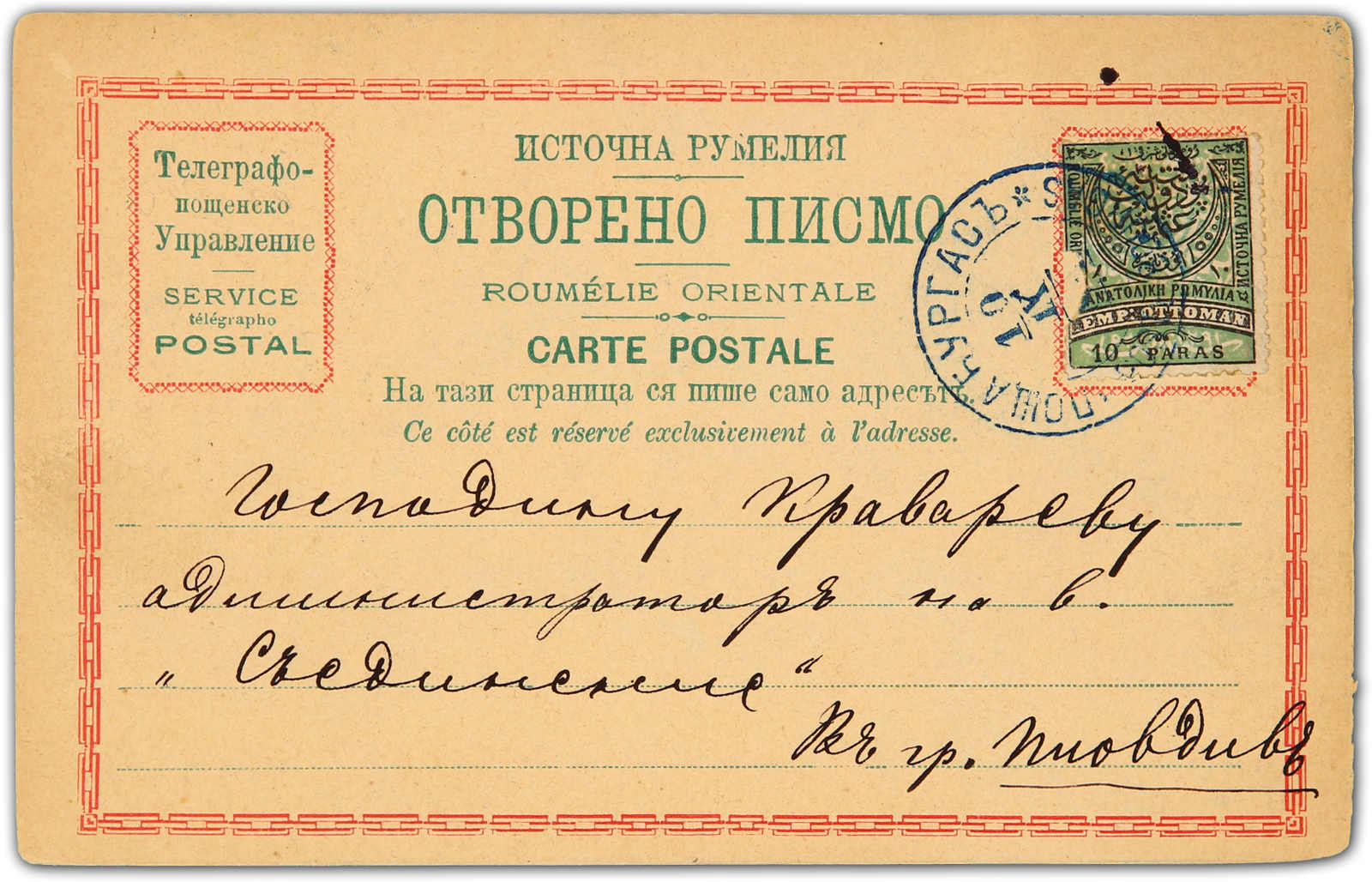 5371 Brief Michel:7 imageBourgas-Burgas: 1884, official formula card bearing 10 para tied by bilingual "POSTA BURGAS" cds, on reverse bilingual "PHILIPOPOPLE" arrival cds (Image) (imagea)