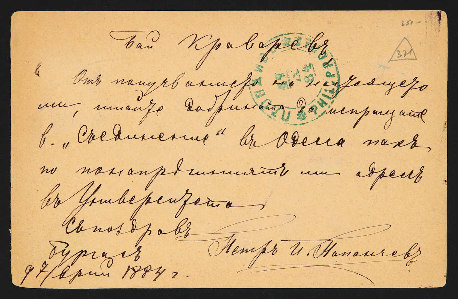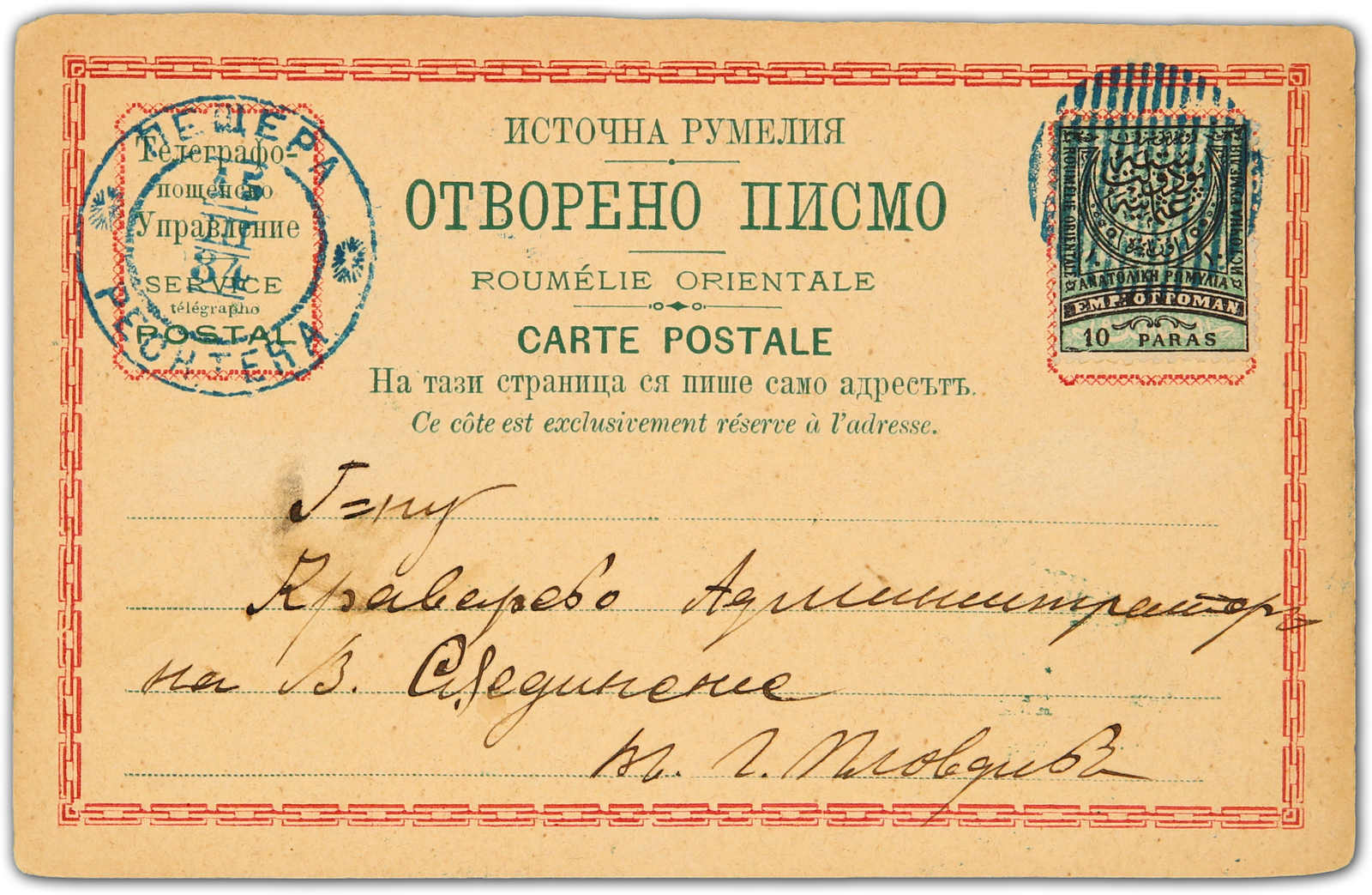 5372 Brief Michel:7 imagePechtera: 1884, official formula card bearing 10 para tied by circular barred hammer struck, alongside showing bilingual "PECHTERA" cds, sent to Plovdiv, on reverse arrival cds (Image) (imagea)