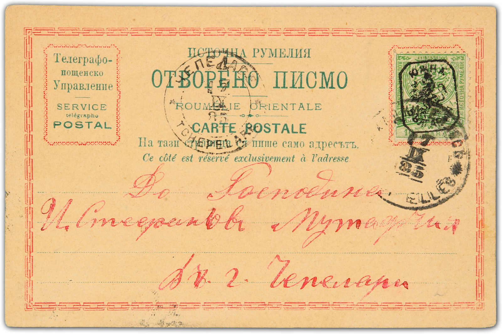 5373 Brief Michel:24 imageHadji-Elles -Parvomay: 1885, official formula card bearing 10 para tied by bilingual "HADJI ELLES" cds, alongside Tchepelare transit, sent to Plovdiv (Image)
