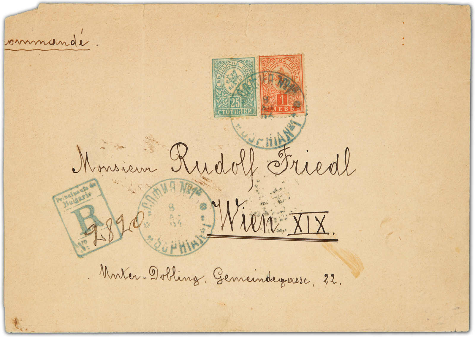 5376 Brief Michel:34,37 image1889 Small Lion issue: 1894, registered cover sent from Sofia to Vienna bearing Small Lion 25 st. blue and scarce 1 Leva orange-red tied by bilingual "SOPHIANo.1" cds in blue, with "Principauté de Bulgarie-R" registration handstamp alongside, reverse with Wien arrival cds (Image) (imagea)