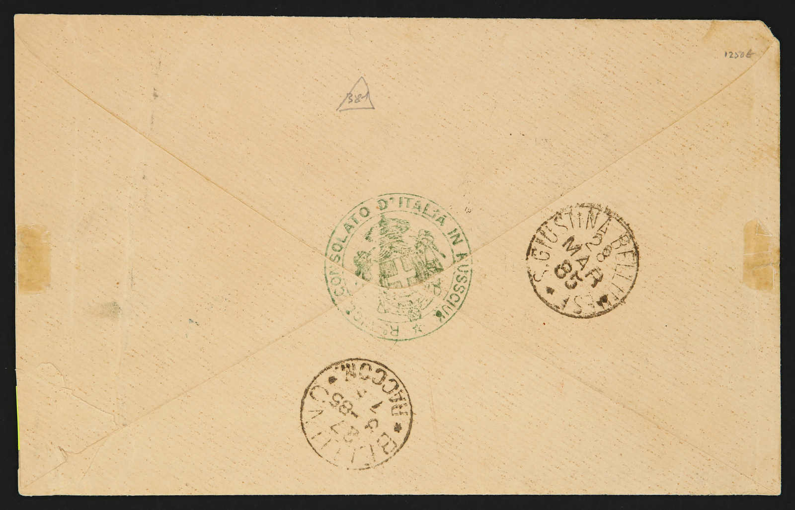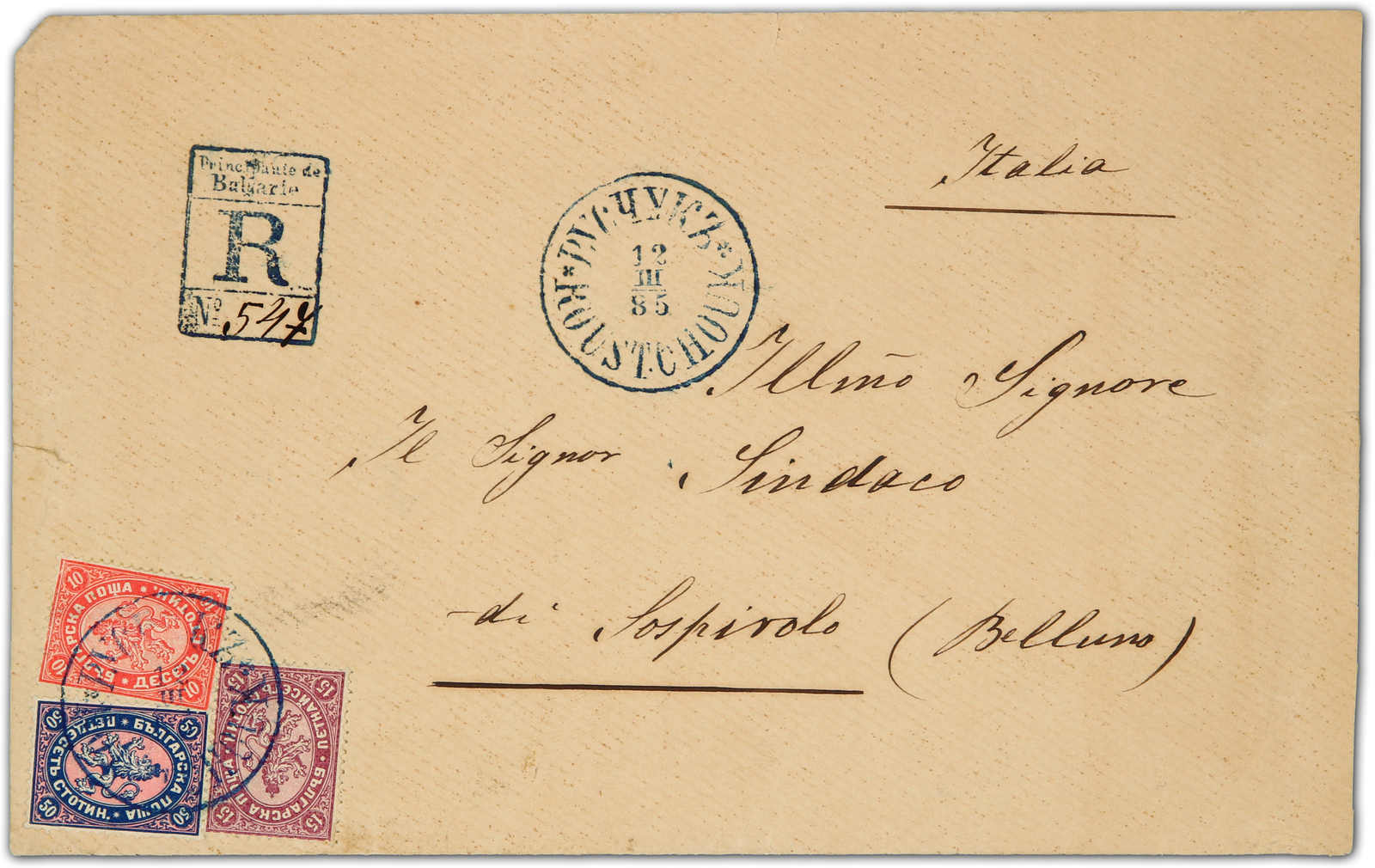 5381 Brief Michel:17,16,20 image1885, registered three colour cover sent from Roustchouk Italian consulate to Italy bearing 10 st, 15 st, and 50 st, total 75 st rate tied by bilingual "ROUSTCHOUK12.III.85" postmark, on reverse transit and arrival cds (Image) (imagea)