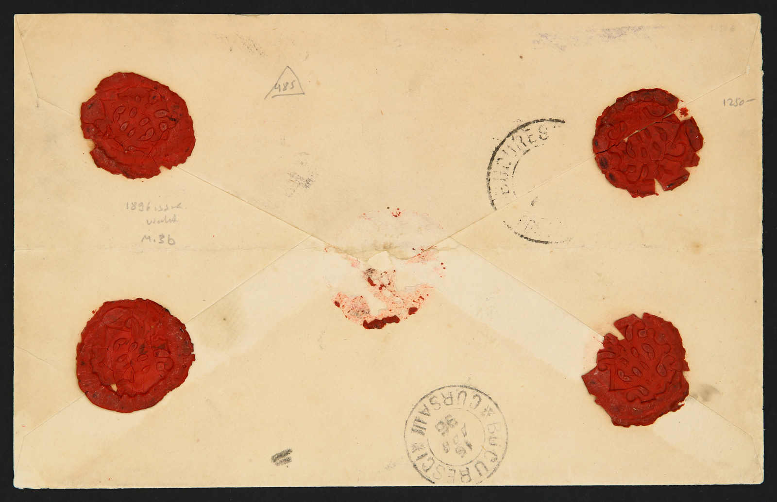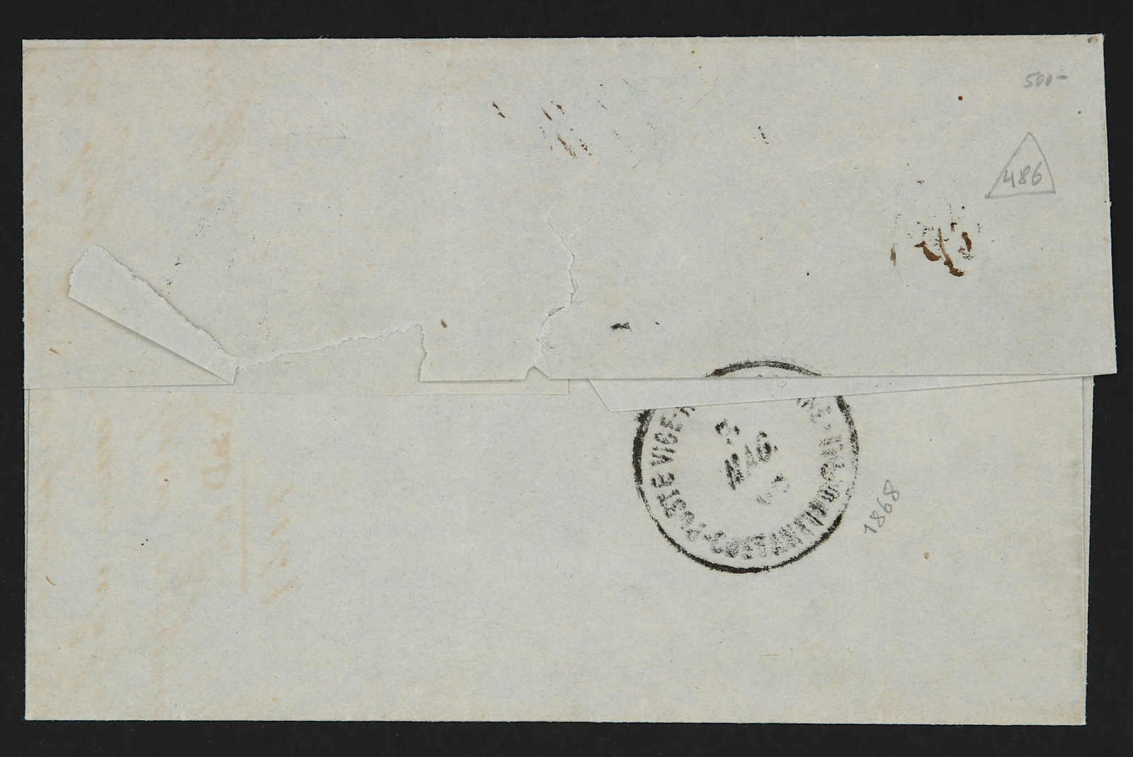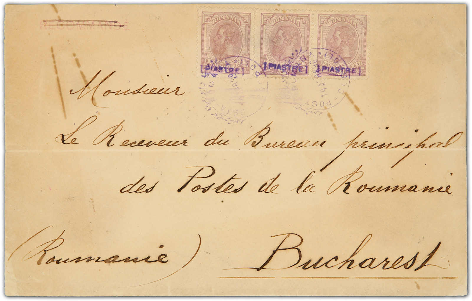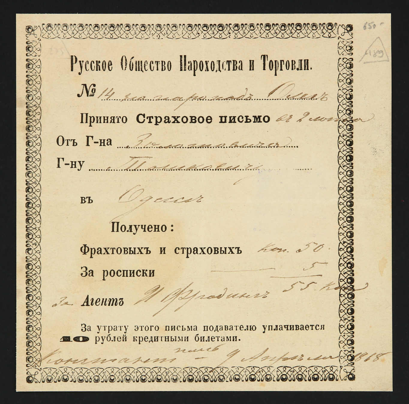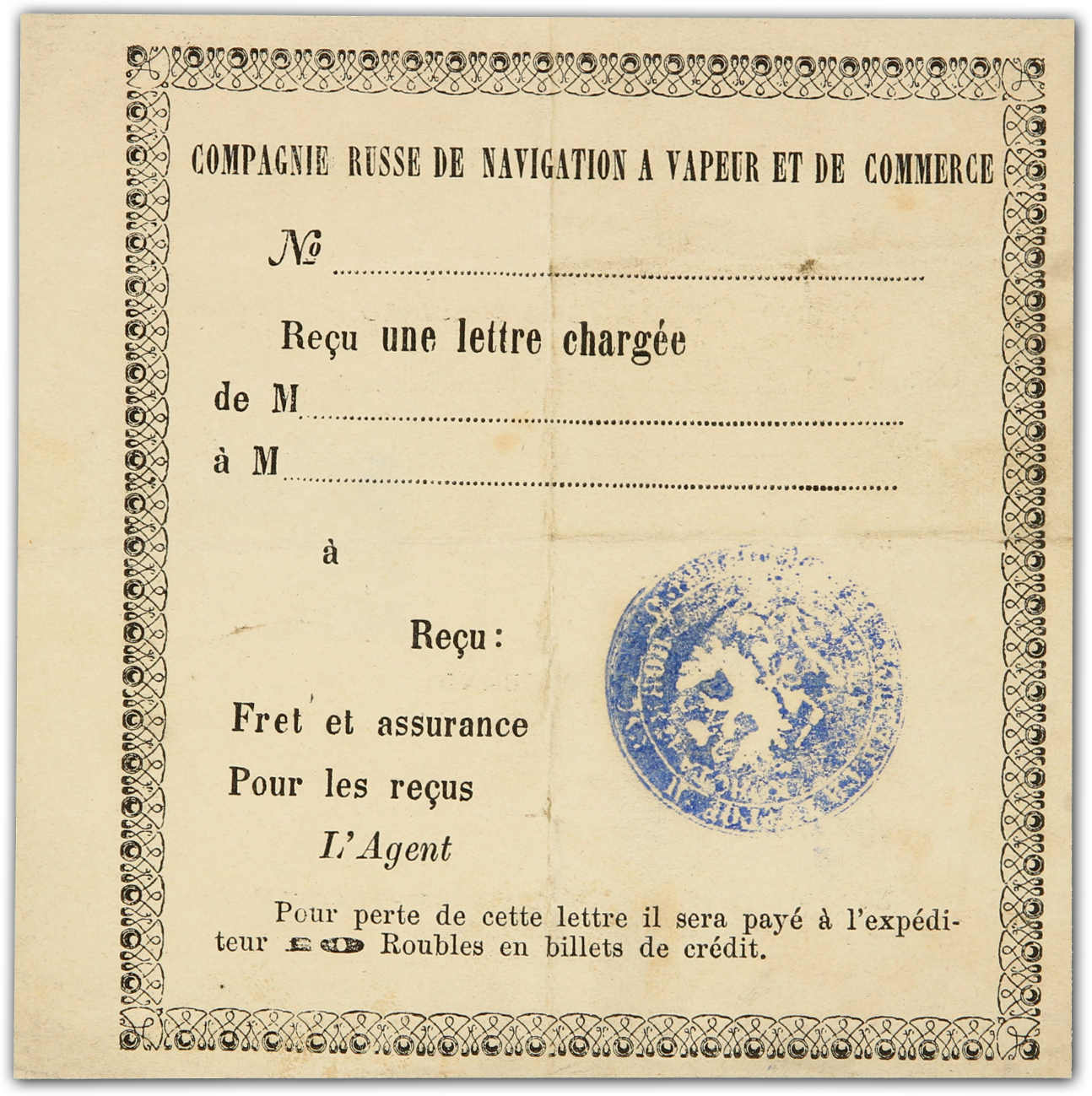 Constantinople: 1868, registered letter receipt for letter sent to Odessa from Constantinople showing all Cyrillic extremely rare negative intaglio seal of Constantinople R.O.P.I.T. agency in violet, very fine and extremely rare,