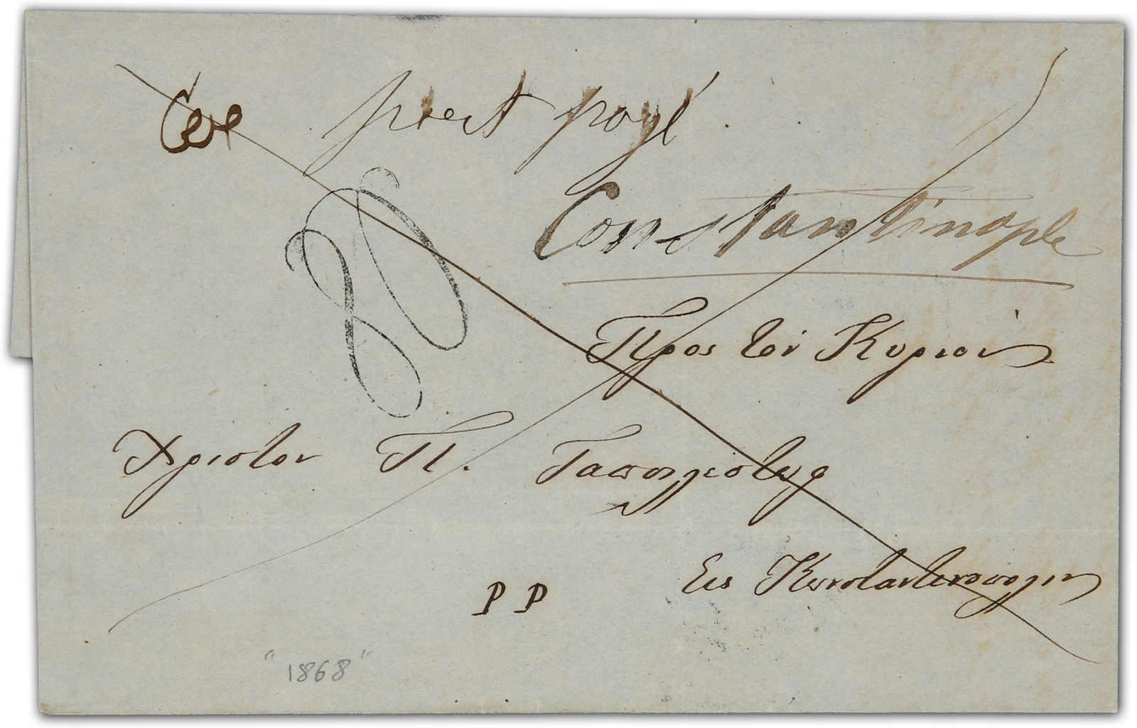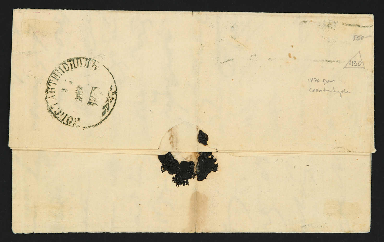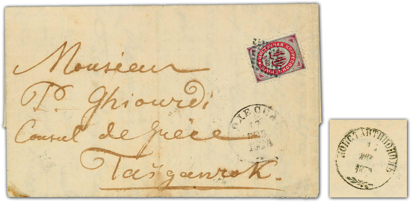 Constantinople: 1870, entire letter sent from Constantinople to Taganrog bearing single franking 10 kop. tied by dotted retta postmark, alongside "Odessa" transit cds, on reverse circular with ornament "KONSTANTINOPOL" cds (Image) (imagea)