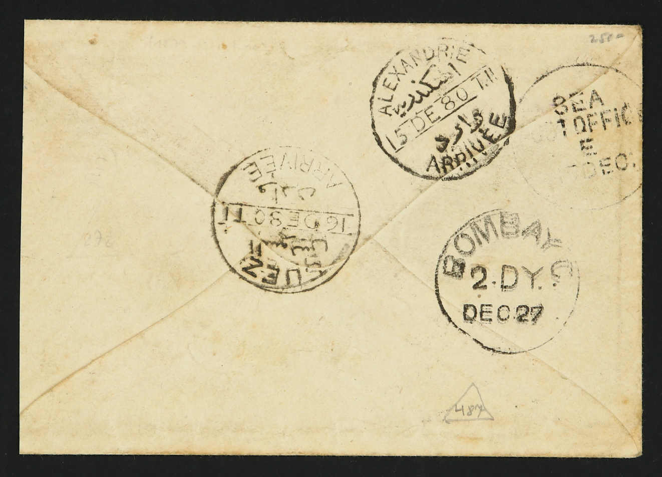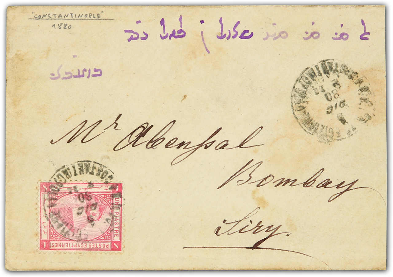 Constantinople: 1880, cover sent from Constantinople to Bombay via Suez bearing 1 piastre red single franking tied by circular "V.R.Poste Egiziane/Costantinopoli" postmark, reverse Suez, Alexandrie, Sea Post Office transit with Bombay (27