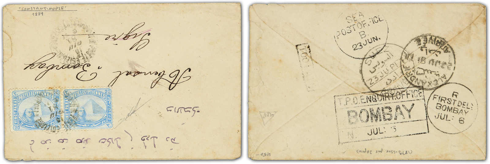 Constantinople: 1880, cover sent from Constantinople to Bombay with 1879 issue 20pa blue pair tied by circular "V.R.Poste Egiziane / Constantinopol" postmark with further strike adjacent, reverse with Suez, Alexandrie and Sea Post Office,