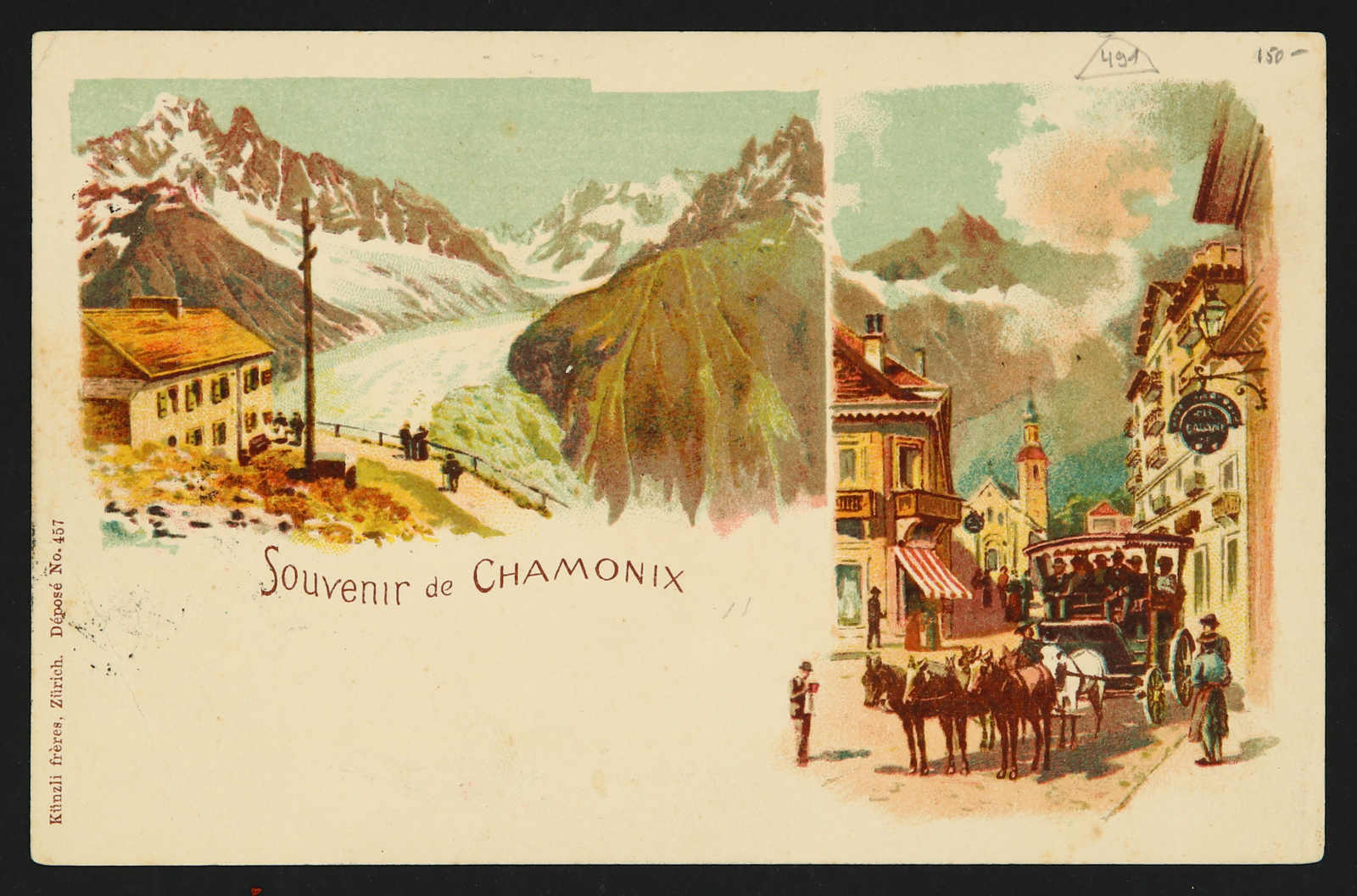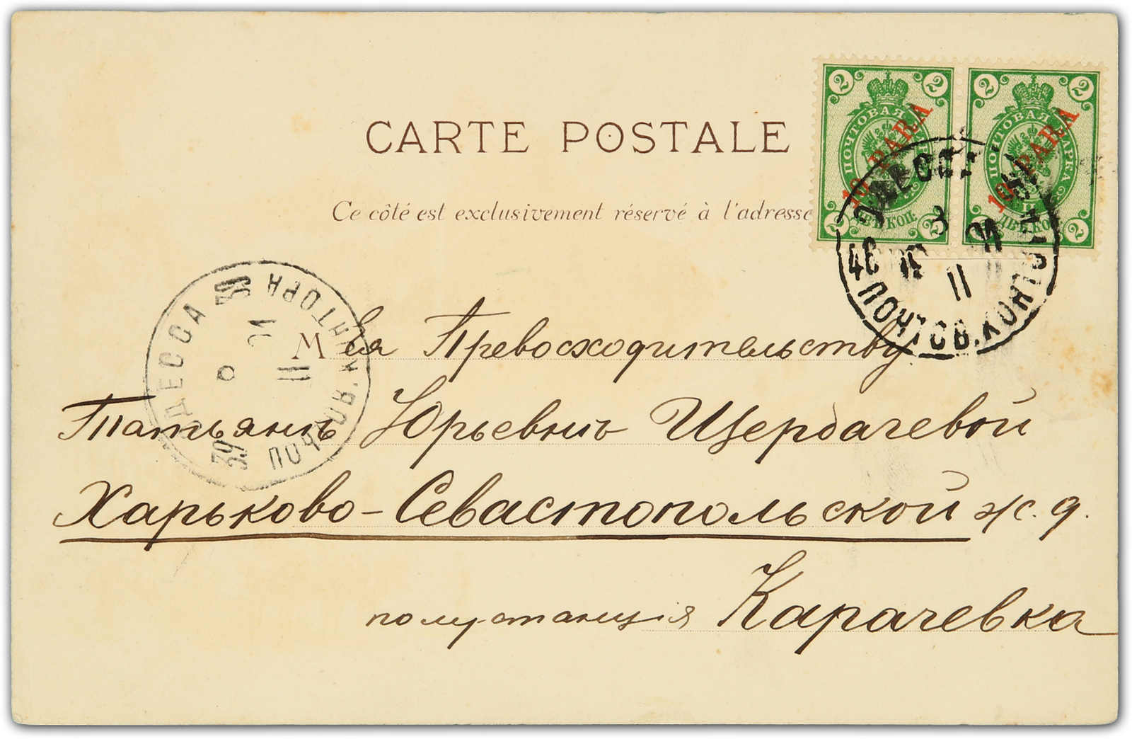 1901, swiss litho card of Chamonix used in Russia sent from Odessa to Harkovo bearing Russian levant 10 para overprinted pair stamp used by circular "Odessa" cds, alongside also showing transit cds (Image) (imagea)
