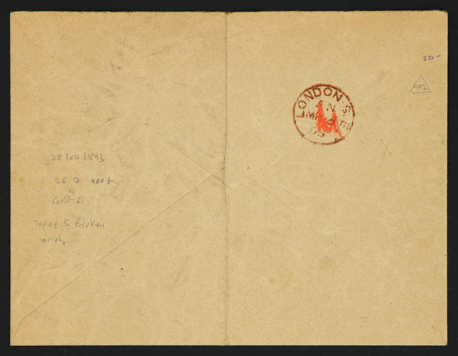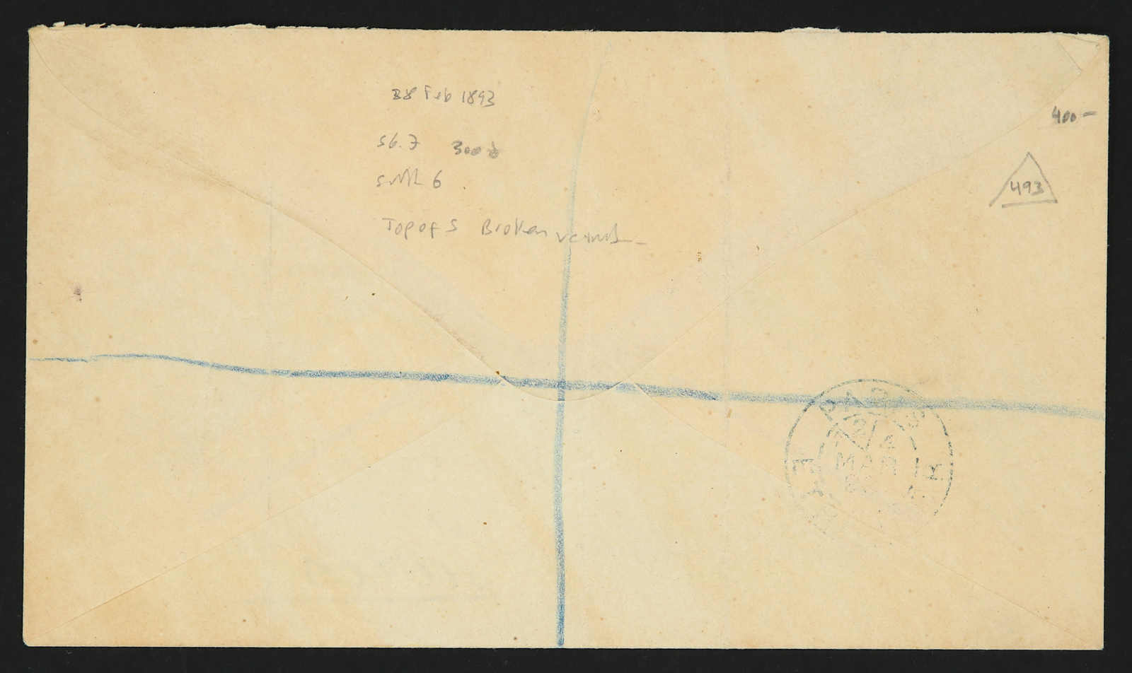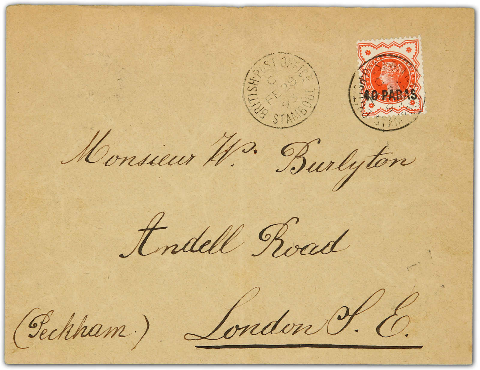1893, single franking provisional stamp of 40 paras handstamped on cover tied by circular "British post Office / Stamboul 29 Feb 93" postmark sent to London, also showing "Top of S broken" variety "S.G. 7 = Scott 6), on reverse London