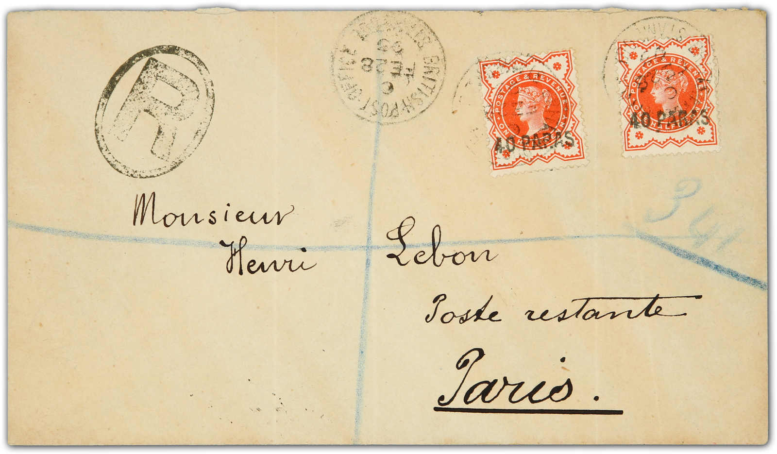 1893, registered double franking provisional stamps of 40 paras hand stamped on cover tied by circular "British post Office / Stamboul 28 Feb 93" postmarks sent to Paris, also showing "Top of S broken" variety on both stamps (S.G. 7 =