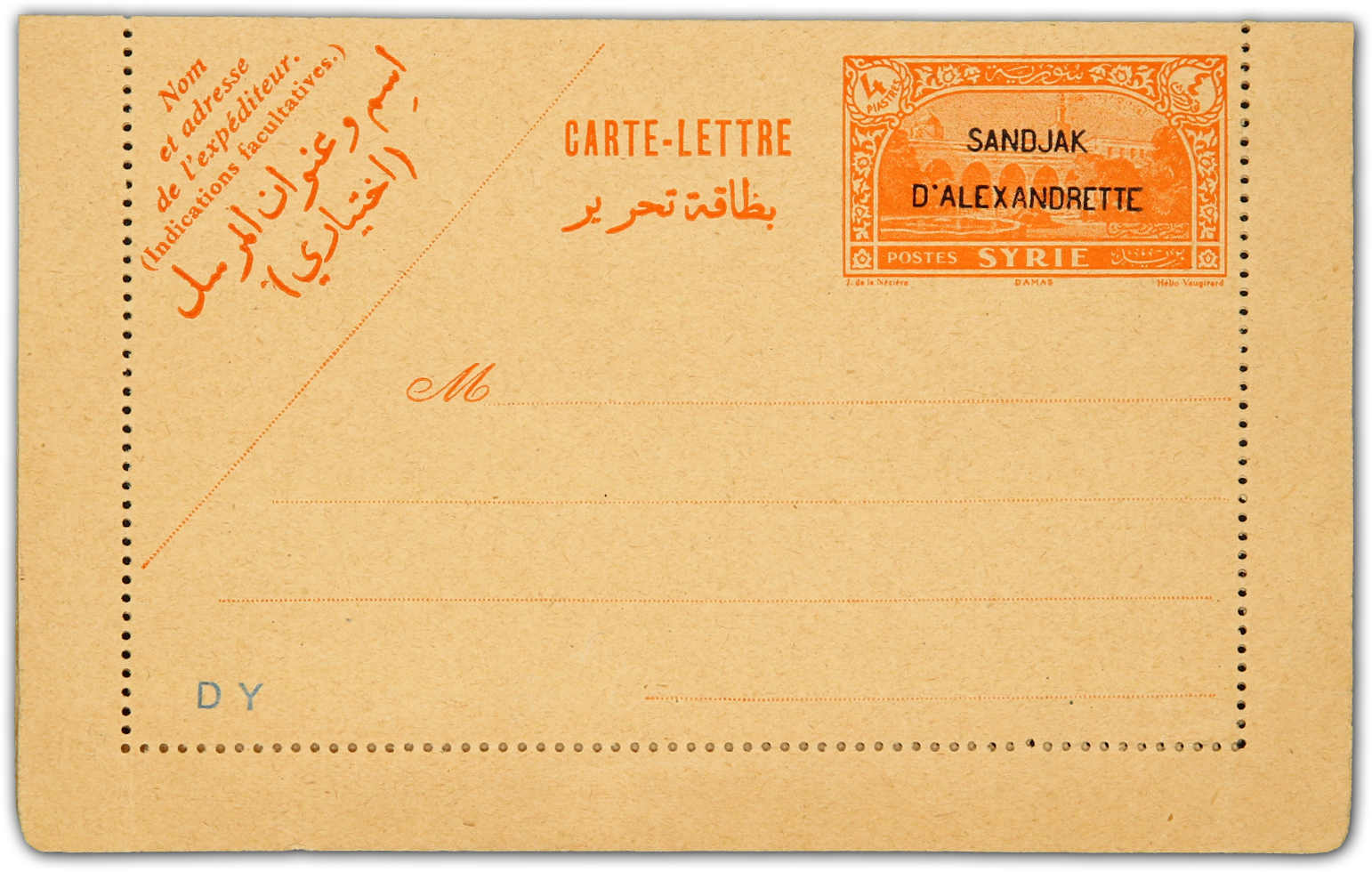 1938, 4 piastres "sandjak D'alexandrette" overprinted unused letter-card (Image)