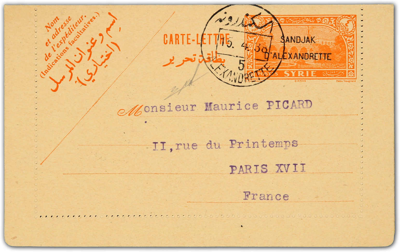 1938, 4 piastres "sandjak D'alexandrette" overprinted used letter-card showing bilingual "Alexandrette 5" postmark dated 15.4.38, first day of issue sent to Paris, on reverse arrival cds, signed Nakri (Image) (imagea)