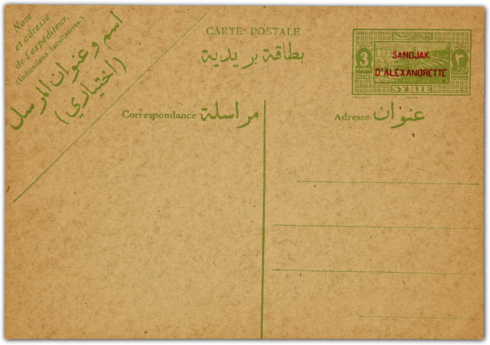 1938, 3 piastres "sandjak D'alexandrette" overprinted unused postal card (Image)
