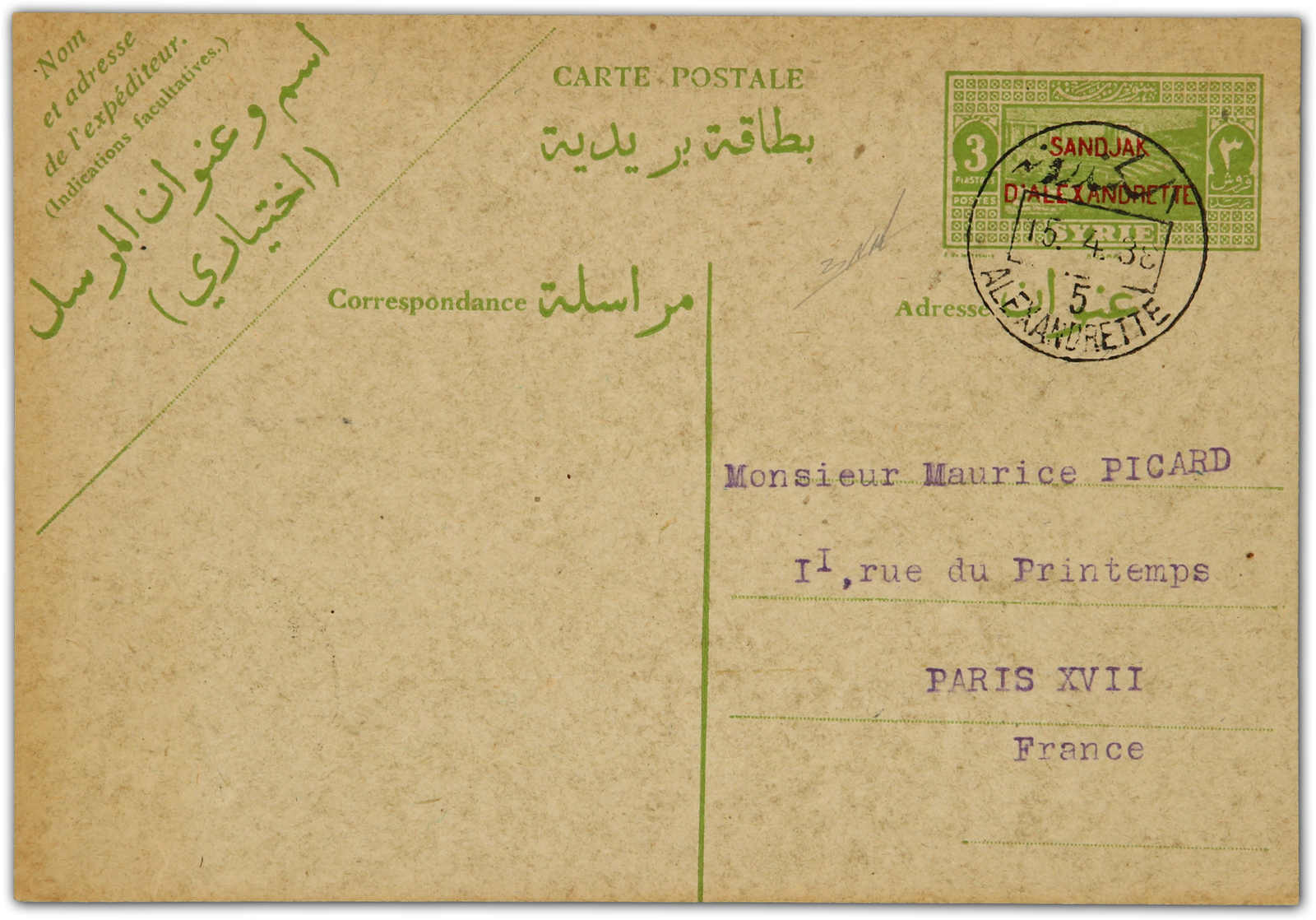 1938, 3 piastres "sandjak D'alexandrette" overprinted used postal-card showing bilingual "Alexandrette 5" postmark dated 15.4.38, first day of issue sent to Paris, on reverse arrival cds, signed Nakri (Image) (imagea)