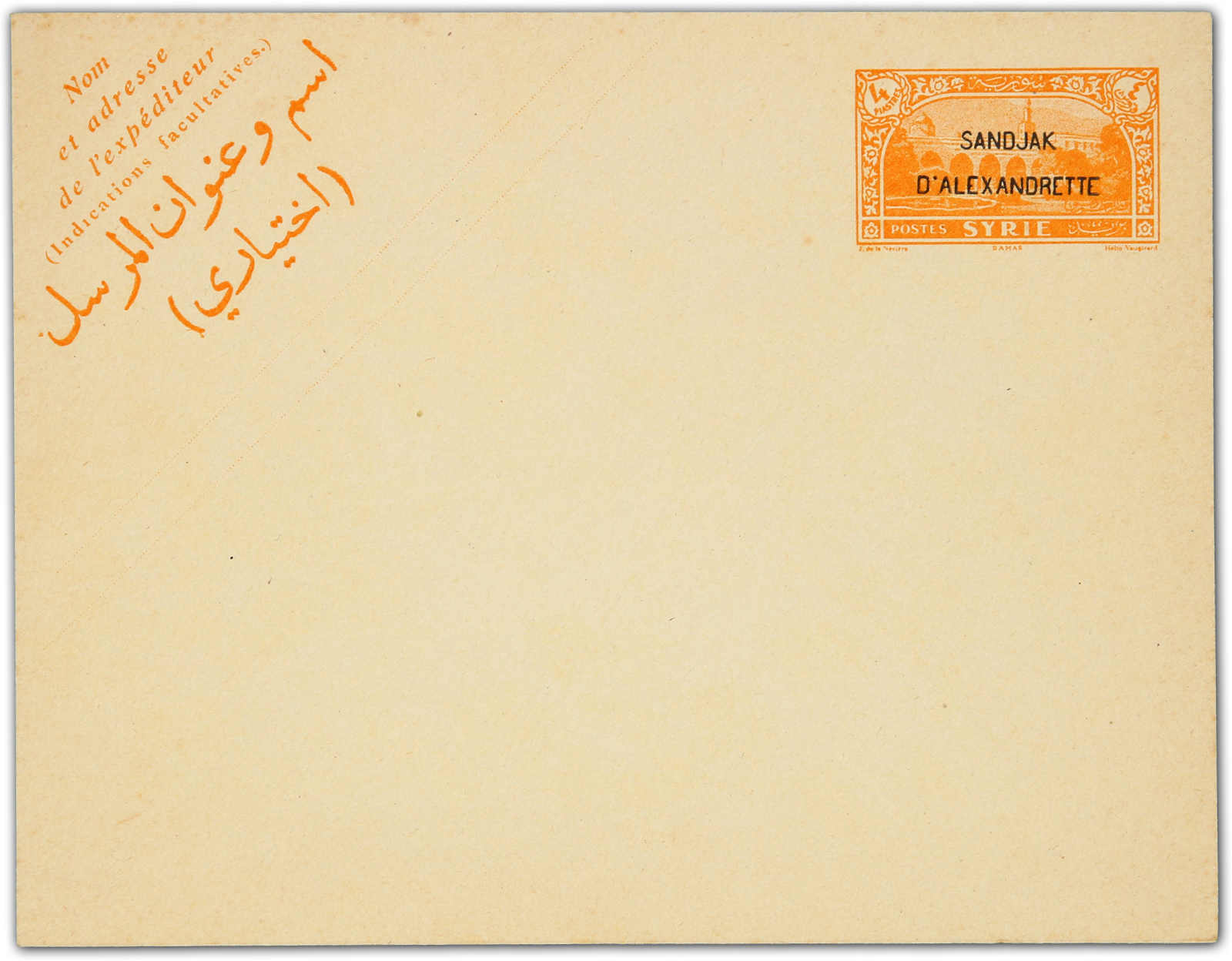 1938, 4 piastres "sandjak D'alexandrette" overprinted unused stationery envelope (Image)