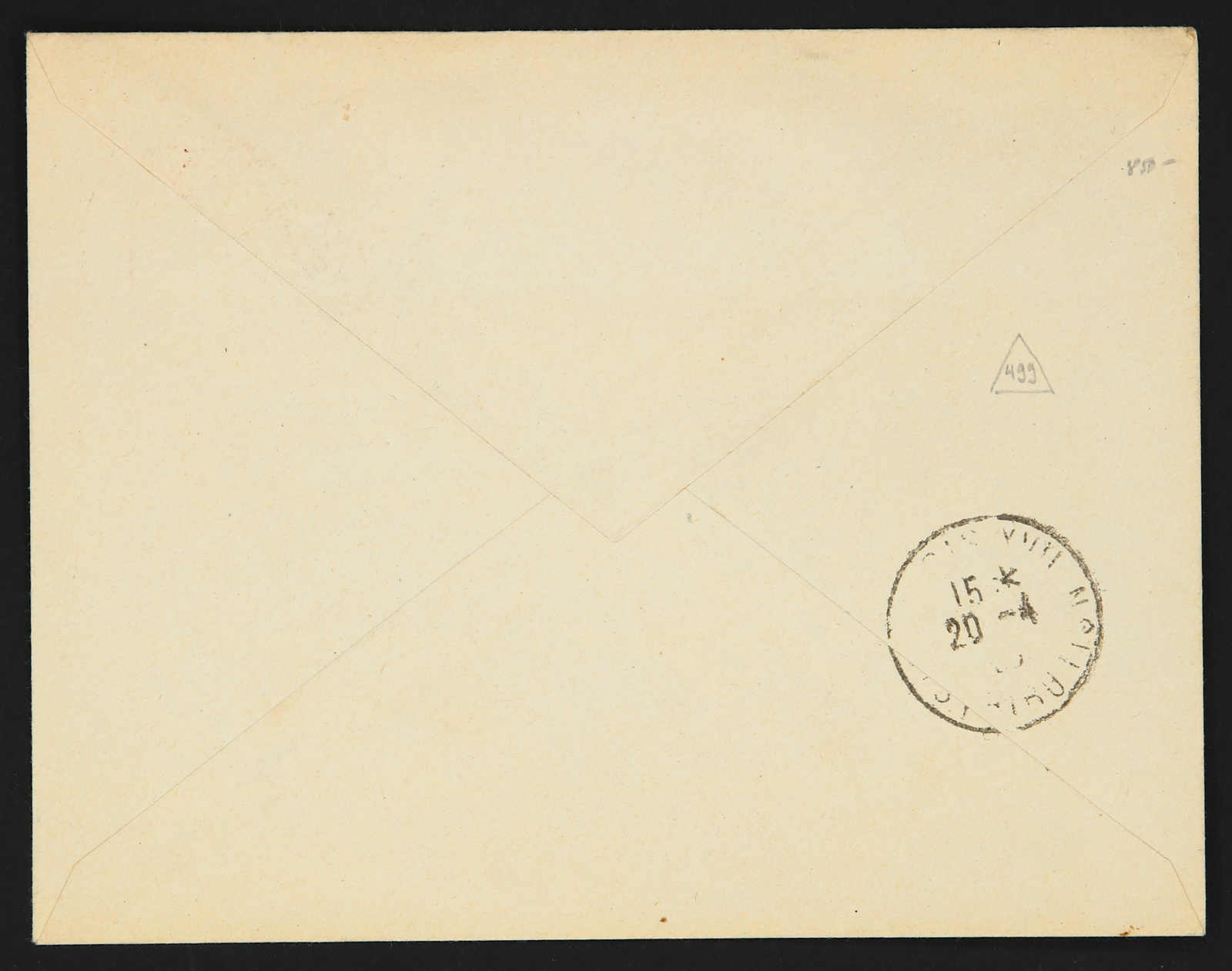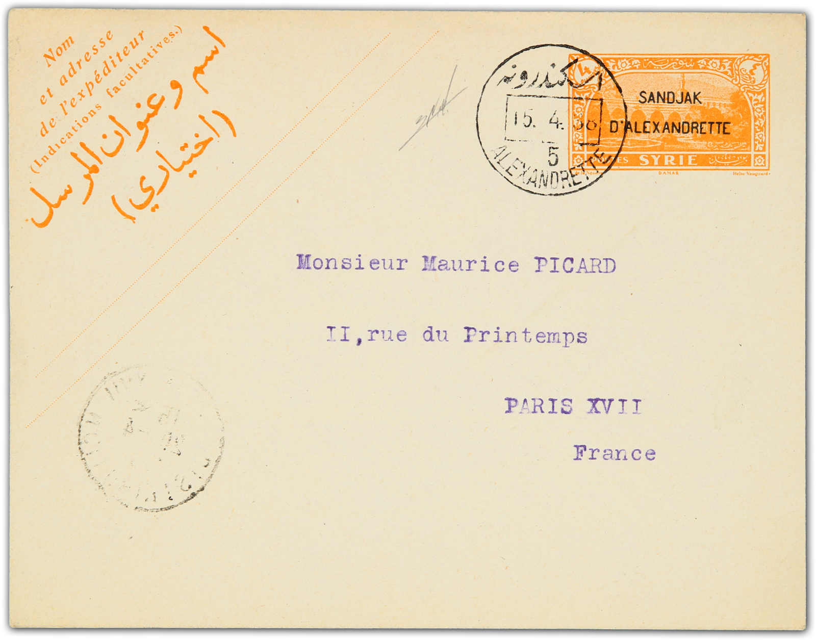 1938 ,4 piastres "sandjak D'alexandrette" overprinted used stationery envelope showing bilingual "Alexandrette 5" postmark dated 15.4.38, first day of issue sent to Paris, on reverse arrival cds, signed Nakri (Image) (imagea)