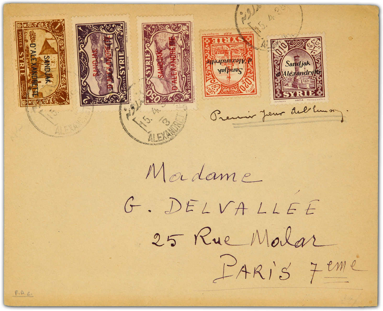 1938, cover bearing first issue five value tied by bilingual "Alexandrette 3" postmarks dated 15.4.38, first day of issue sent to Paris (Image)