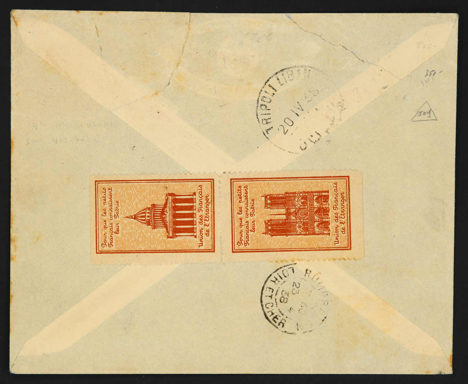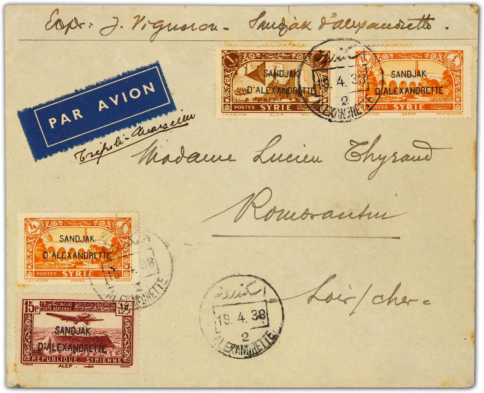 1938, airmail cover sent from Alexandrette to France bearing 1 pia, 2x4 pia. and 15 piastres tied by bilingual "Alexandrette 2" postmarks dated 19.4.38 sent to France via Tripoli, on reverse arrival cds (Yvert 5+9+A.7) (Image) (imagea)