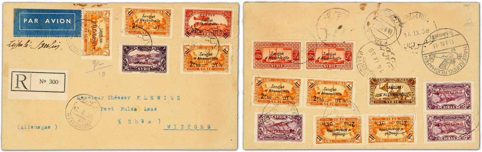 1938, registered airmail multi franking cover (opened for display) sent from Alexandrette to Wittges/Germany bearing on front 4 pia., 2 pia.,2x 2½ pia. and 12½ pia., on reverse 4x2,5 pia.,3x0.50 pia.,1 pia. and 2x0,75 pia., all tied by