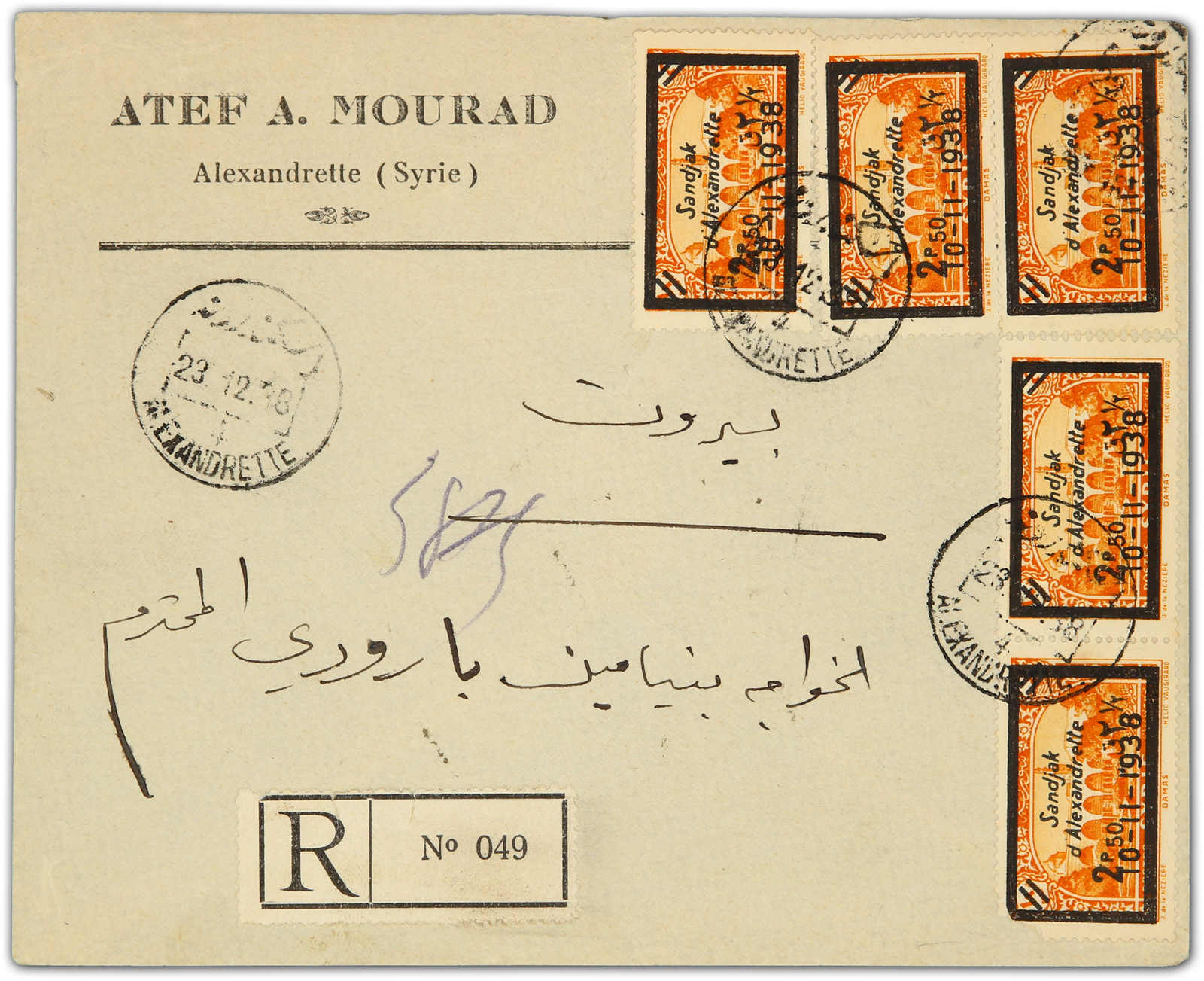 1938, registered cover sent from Alexandrette to Beyrout bearing 5x 2,5 pia. Atatürk mourning issue stamps tied by bilingual "Alexandrette 4" dated 23.12.38 postmarks, alongside "R" white-black registration label No. 049, on reverse