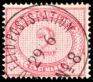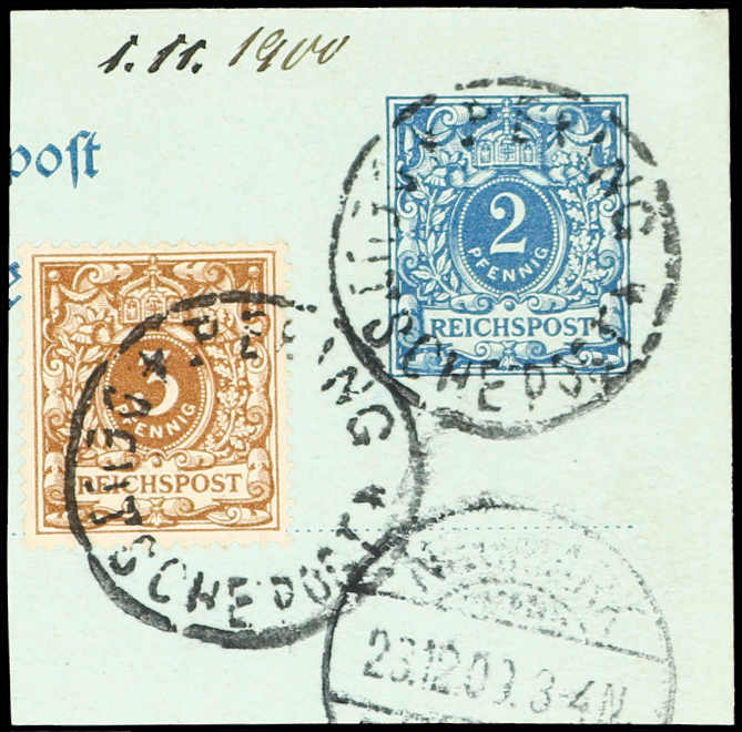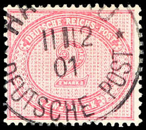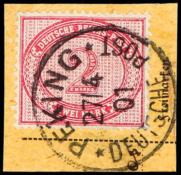 1901, 2 M. Innendienst rötlichkarmin, glasklar entwertet "HA(NKA)U * DEUTSCHE POST 11/12 01", gute Qualität, sehr seltener Stempel auf dieser Marke! Fotoattest Steuer BPP (ME 2.800,-) (Image) (imagea)