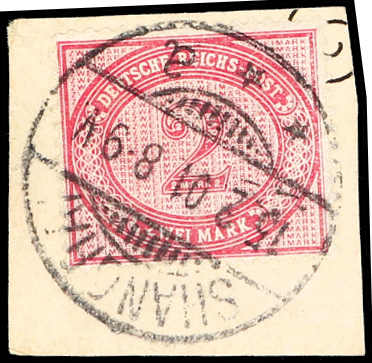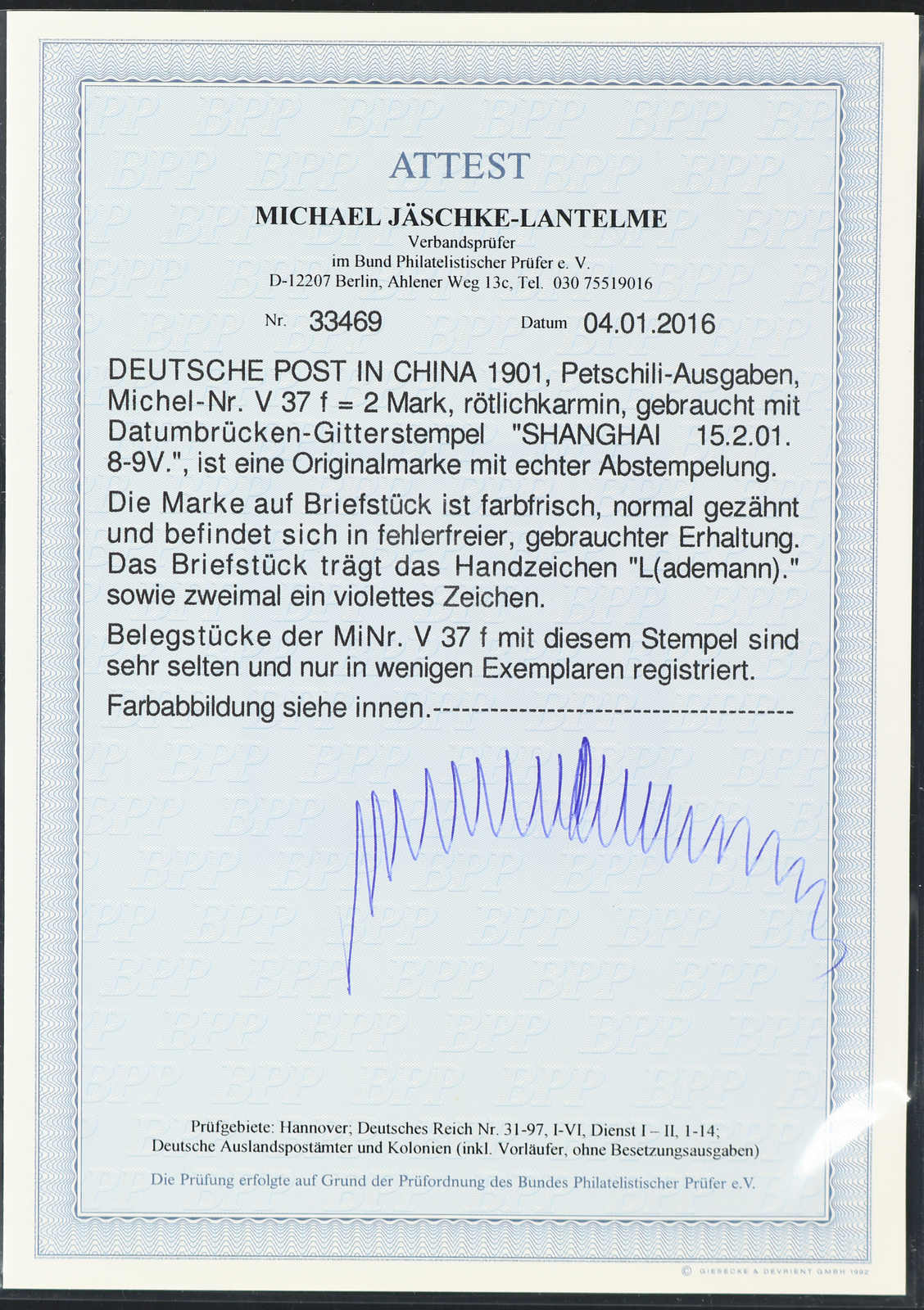 1901, 2 M. Innendienst rötlichkarmin, auf Briefstück mit Entwertung "SHANGHAI 15.2.01", farbfrisch, einwandfrei, signiert, SEHR SELTENER STEMPEL auf dieser Marke! Fotoattest Jäschke-Lantelme BPP (Steuer 4.200,-) (Image) (imagea)