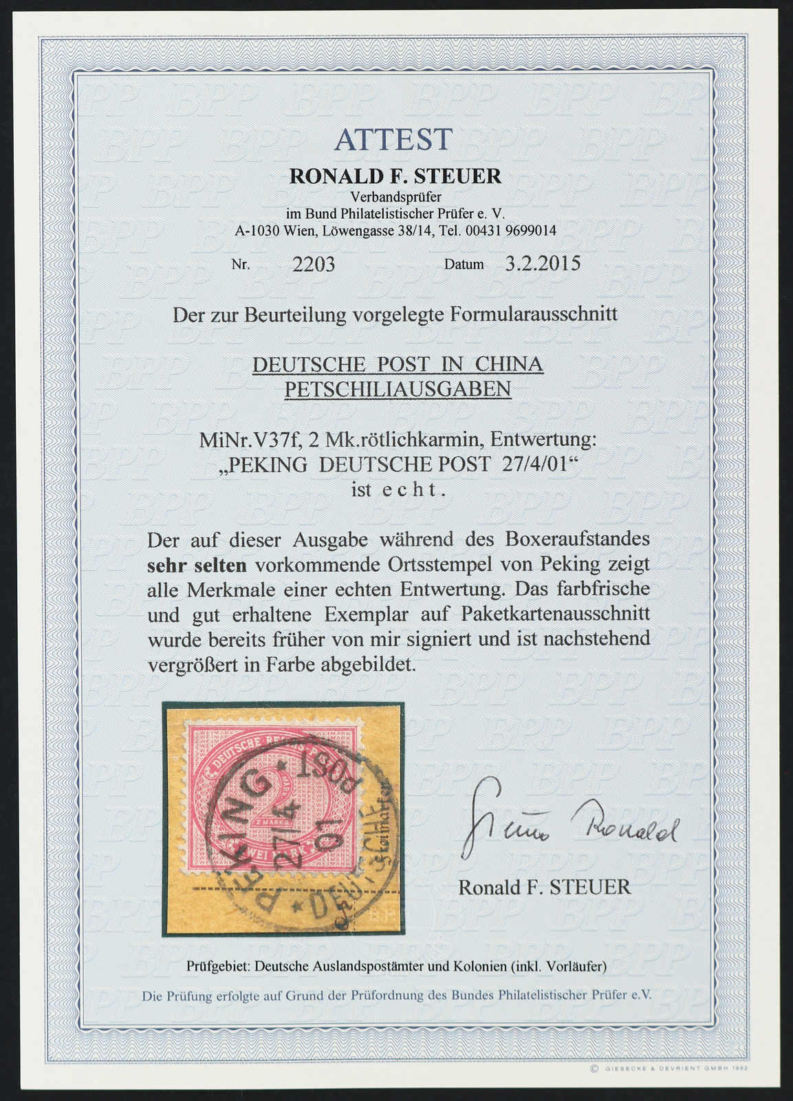 1901, 2 M. Innendienst rötlichkarmin, klar entwertet "PEKING 27/4 01" auf Paketkartenausschnitt, SEHR SELTEN vorkommender Ortsstempel während des Boxeraufstandes, farbfrisch in guter Qualität, Fotoattest Steuer BPP (Steuer 2.100,-) (Image) (imagea)