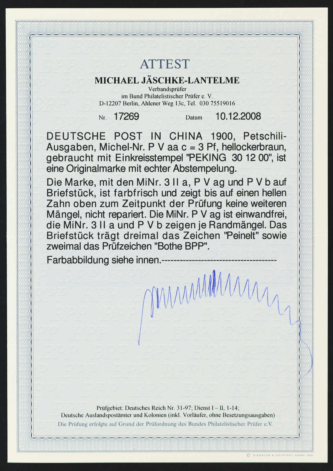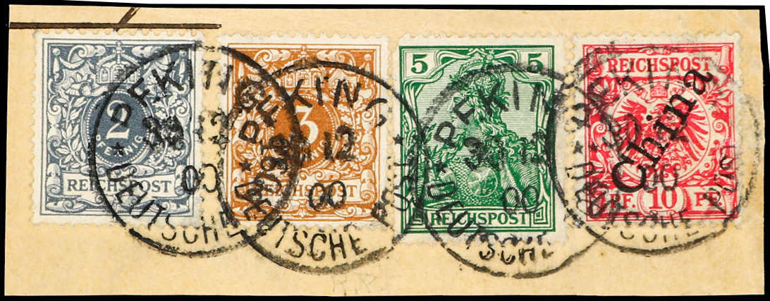 1900, 3 Pfg. hellockerbraun Petschiliausgabe, zusammen mit Mi-Nr. 3 II a, P V ag und P V b auf dekorativem Briefstück mit vier klaren Abschlägen "PEKING 30 12 00", die 3 Pfg. ein heller Zahn oben, die 3 II a und P V b Randeinschränkungen,