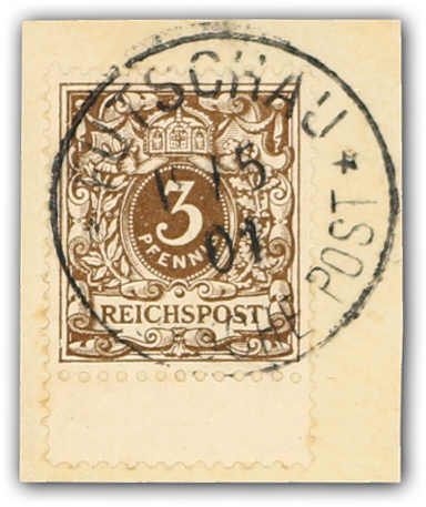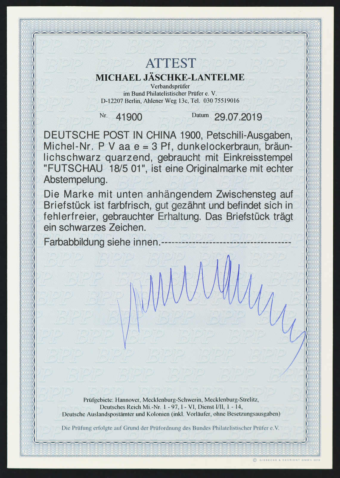 1900, 3 Pfg. dunkelockerbraun, bräunlichschwarz quarzend, Petschiliausgabe, sauber gestempelt "FUTSCHAU 18/5 01" auf Briefstück, unten anhängender Zwischensteg, farbfrisch, einwandfrei, signiert, Fotoattest Jäschke-Lantelme BPP (ME