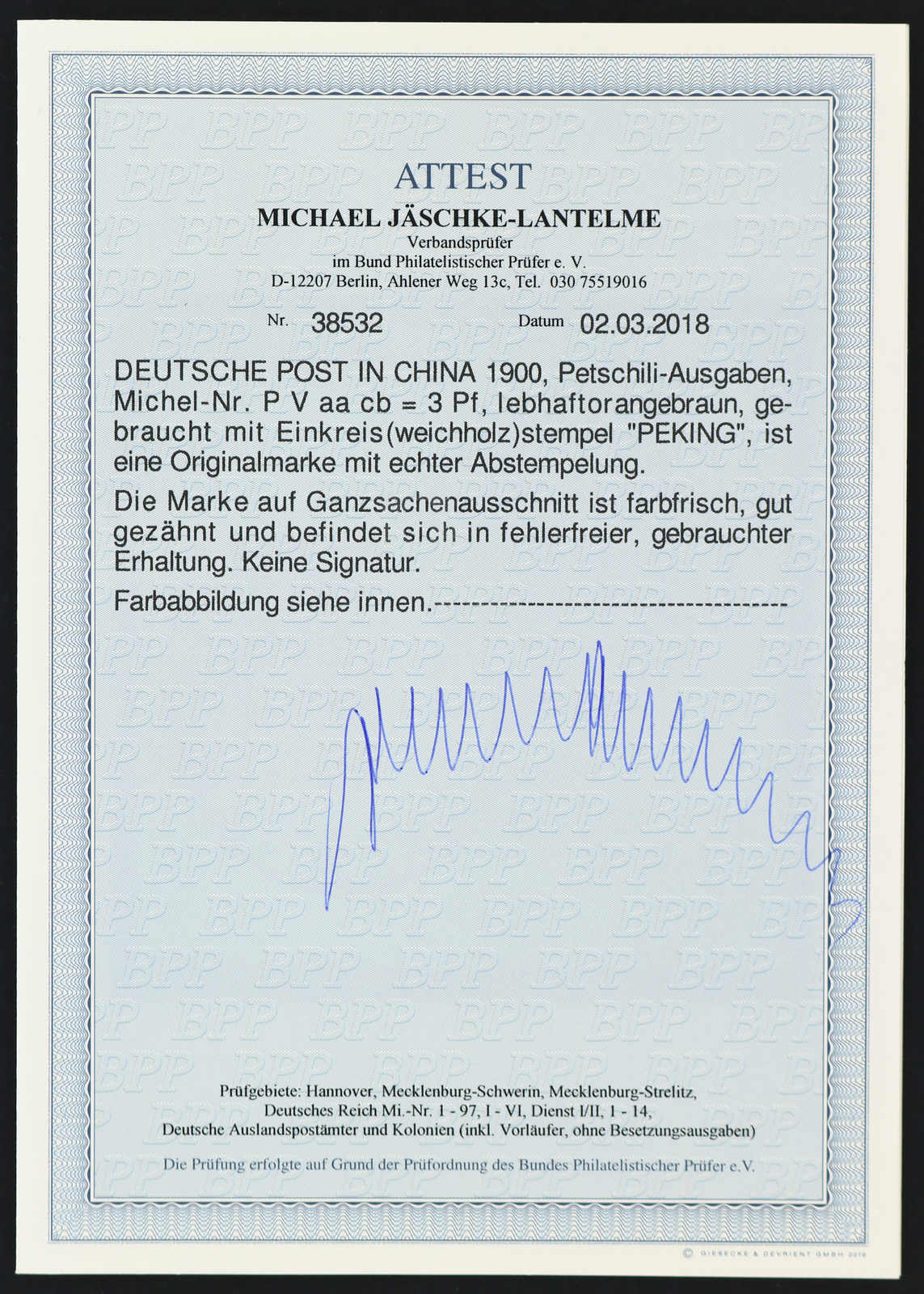 1900, 3 Pfg. lebhaftorangebraun, Petschiliausgabe, klar entwertet mit Weichholzstempel "PEKING" auf Ganzsachenausschnitt, farbfrisch, einwandfrei, Fotoattest Jäschke-Lantelme BPP (ME -,-, lt. Herrn Jäschke-Lantelme ca. 1.500,-, nach