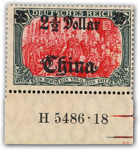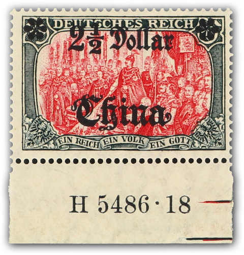1918, 2½ D. auf 5 M. grünschwarz/dunkelkarmin, ungebrauchter Einzelwert vom Unterrand mit der HAN H 5486.18, farbfrisch und gut gezähnt, sign. Bothe BPP, einwandfrei (ME 550,-) (Image)