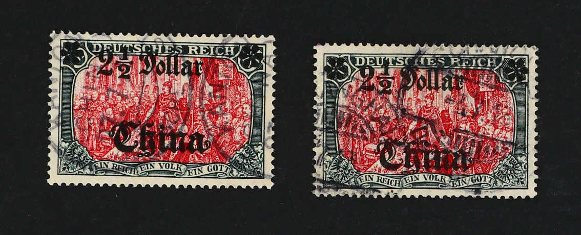1906/07, 2½ D. auf 5 M., grünschwarz/dunkelkarmin, zwei gest. Einzelwerte in den angegebenen Drucktypen, je sign. R. Steuer BPP, einwandfrei (ME 370,-)