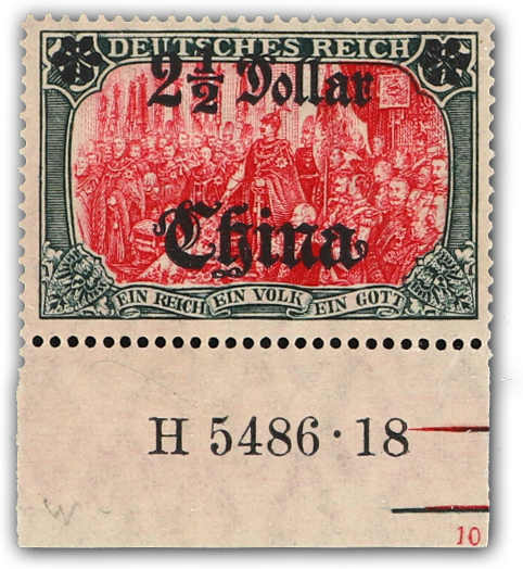 1918, 2½ D. auf 5 M. Aufdruckausgabe grünschwarz/dunkelkarmin, Kriegsdruck, 26:17 Zähnungslöcher, Wertaufdruck Mitte, Abstand 9 mm, postfrisches Exemplar vom Unterrand mit Aufdruck-HAN 5486.18 sowie roter Plattennummer "10", farbfrisch