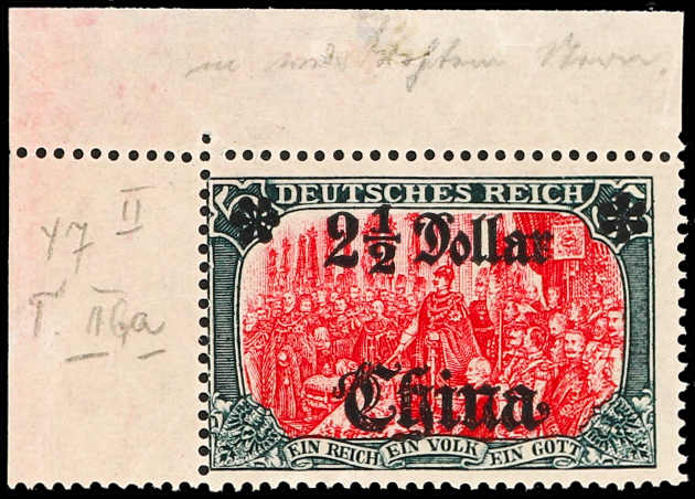 1919, 2½ D. auf 5 M. Aufdruckausgabe grünschwarz/dunkelkarmin, Kriegsdruck, 25:17 Zähnungslöcher, Wertaufdruck Mitte, Abstand 9 mm, mit Aufdruckfehler "rechte Rosette auf einer Spitze", postfrisches Exemplar aus der oberen linken