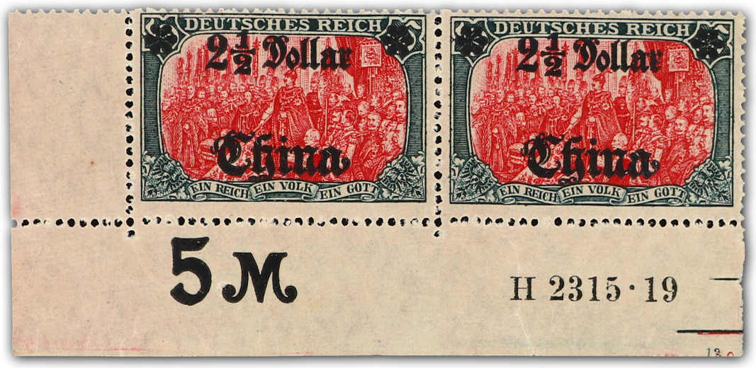 1919, 2½ D. auf 5 M. Aufdruckausgabe grünschwarz/dunkelkarmin, Kriegsdruck, 25:17 Zähnungslöcher, Wertaufdruck Mitte, Abstand 9 mm, waagerechtes Paar aus der unteren linken Bogenecke mit Aufdruck-HAN 2315.19 und Formnummer "13"