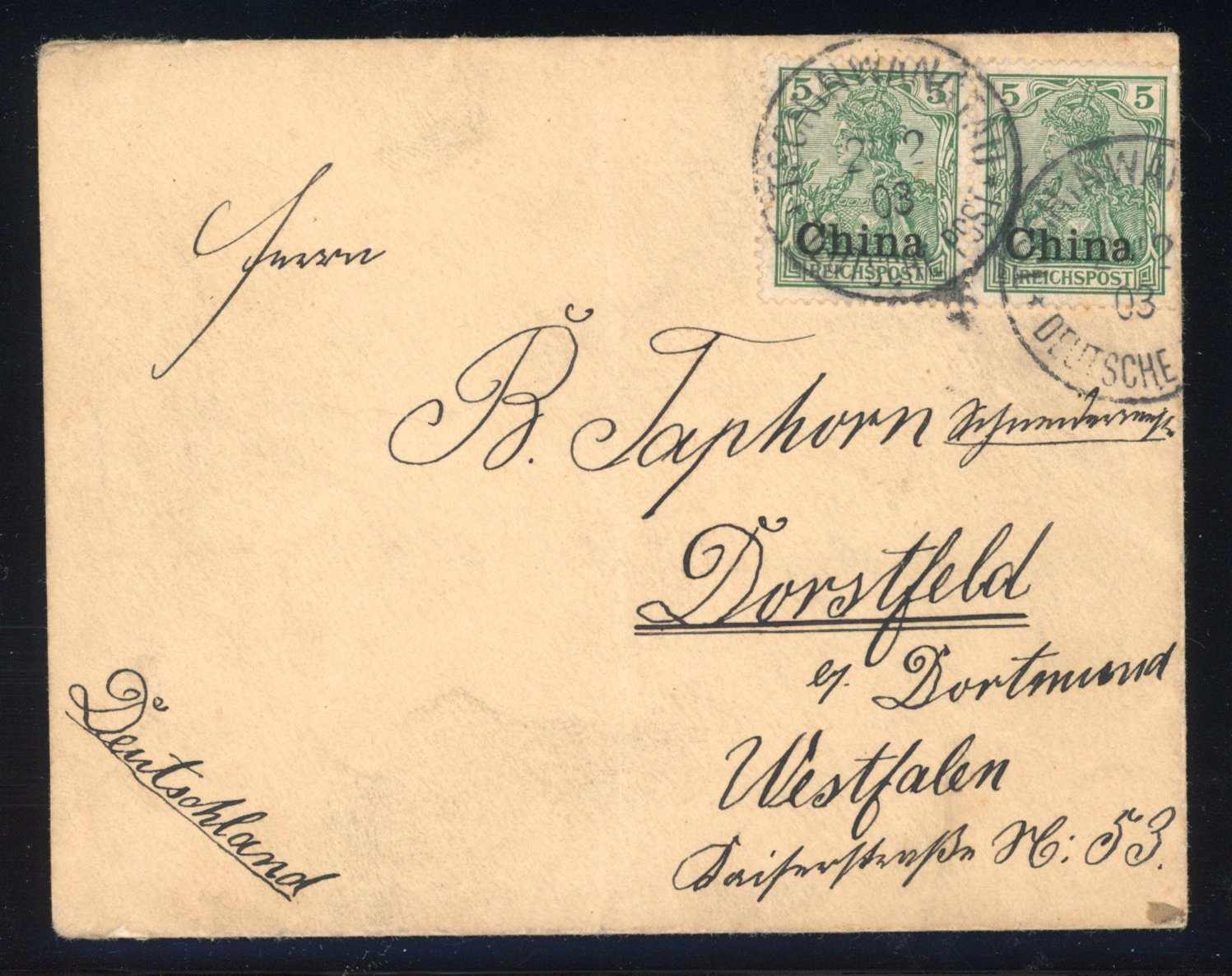 "TSCHINWANGTAU DEUTSCHE POST 21/2 03", zwei klare Abschläge auf Brief, frankiert mit 2 Werten der Mi-Nr. 16, adressiert nach Deutschland, rücks. Ankunftsstp. vom 13.1.04, rechte Marke mit Zahnverkürzungen, Umschlag senkrecht gefaltet (Image)