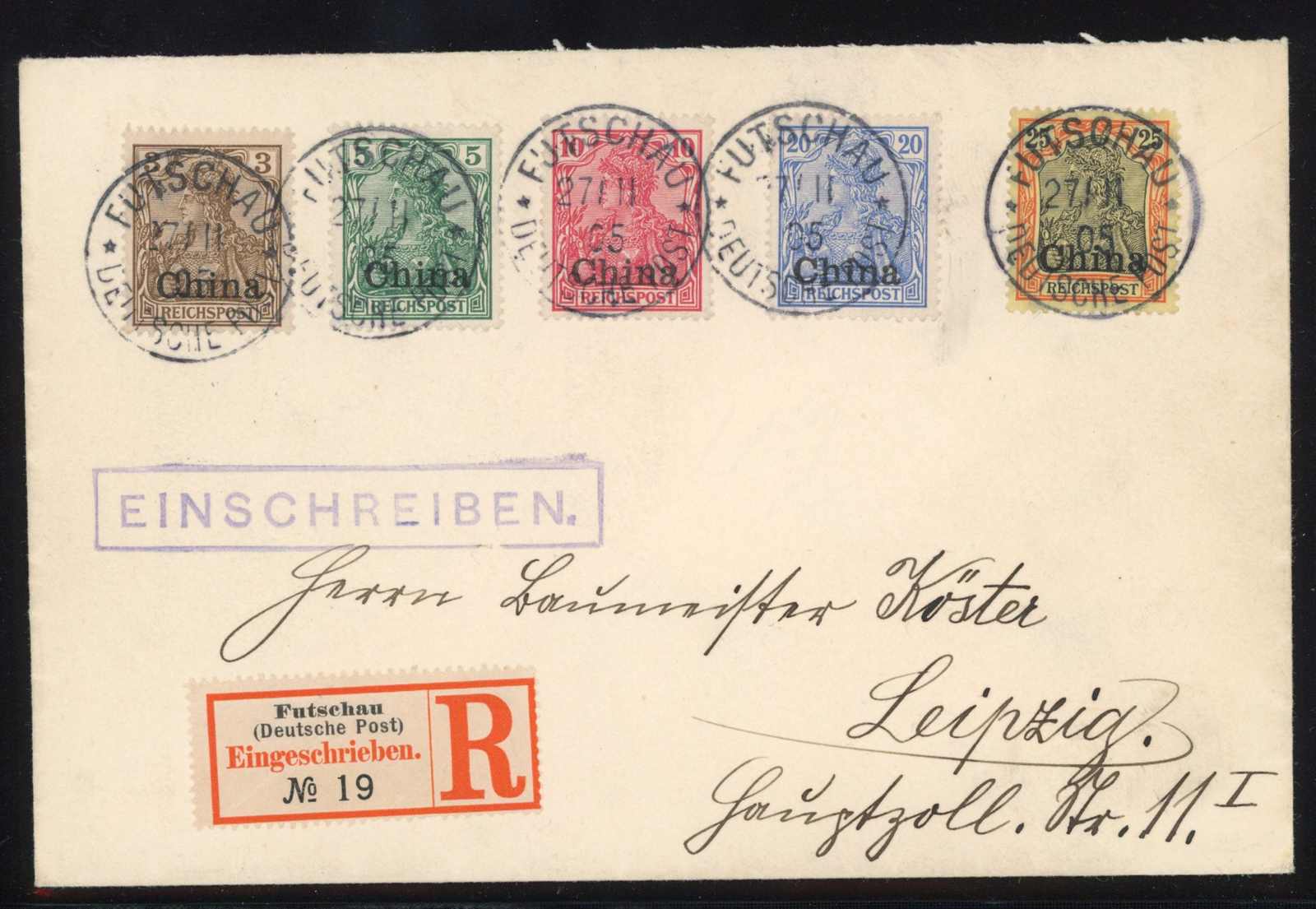 "FUTSCHAU DEUTSCHE POST 27/11 05", 5 klare Abschläge auf Sammler-Einschreibbrief, frankiert mit Mi-Nr. 15-19 (letztere eckrund), adressiert nach Leipzig, rückseitig mit Ankunftsstp., sign. Friedemann (Image)
