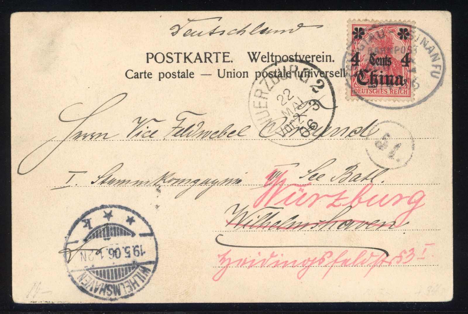 "TSINGTAU-TSINANFU BAHNPOST ZUG 2 10.4.06" mit Aushilfszahl "2" in der Zug-Nr., klarer Abschlag auf frankierter Ansichtskarte, adressiert nach Wilhelmshaven, Nachsendung nach Würzburg, je mit Ankunftsstp., viel Bedarfstext, gute